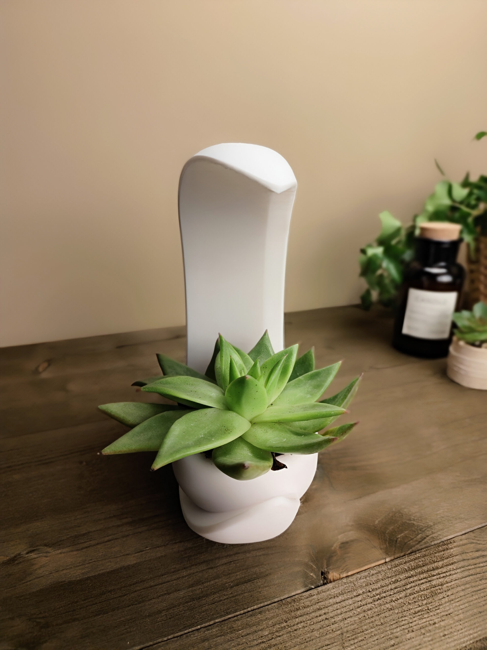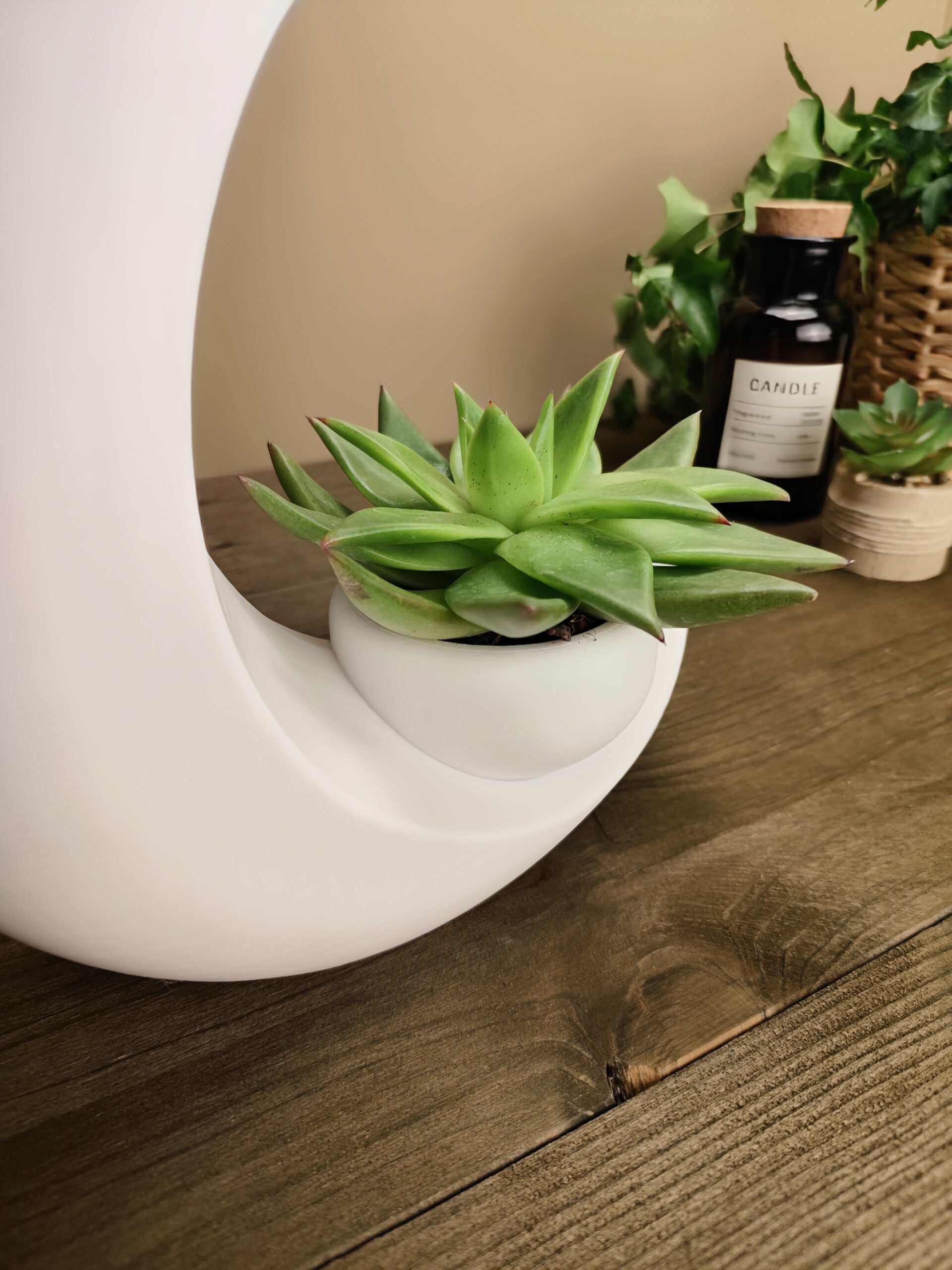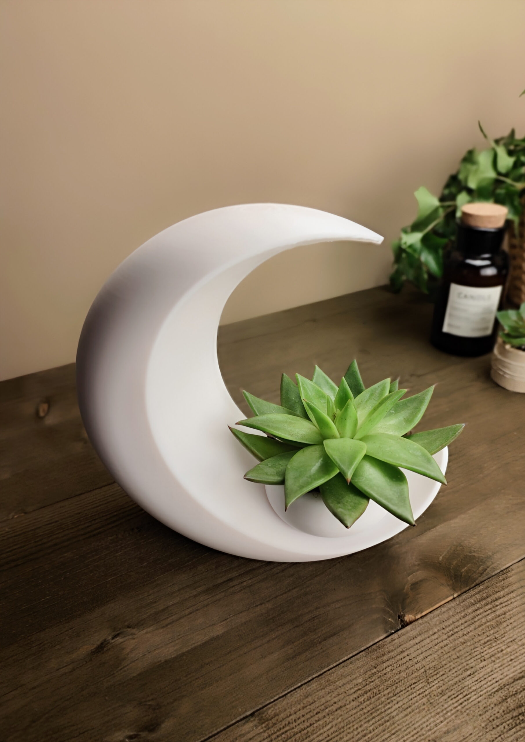 Elegantes Mond-Design als fertiges, 3D-gedrucktes Pflanzgefäß für Sukkulenten und kleine Zimmerpflanzen. Das Gefäß verfügt über eine vergrößerte Schale sowie eine überarbeitete Silhouette mit akzentuierten Abschrägungen und klaren Kanten. Dadurch entsteht ein modernes, dezentes Dekoelement, das sich gut auf Fensterbänken, Regalen oder Schreibtischen macht. Das Produkt wird fertig geliefert und ist sofort einsatzbereit als dekoratives Pflanzgefäß oder als Blickfang in Wohn- und Arbeitsräumen.