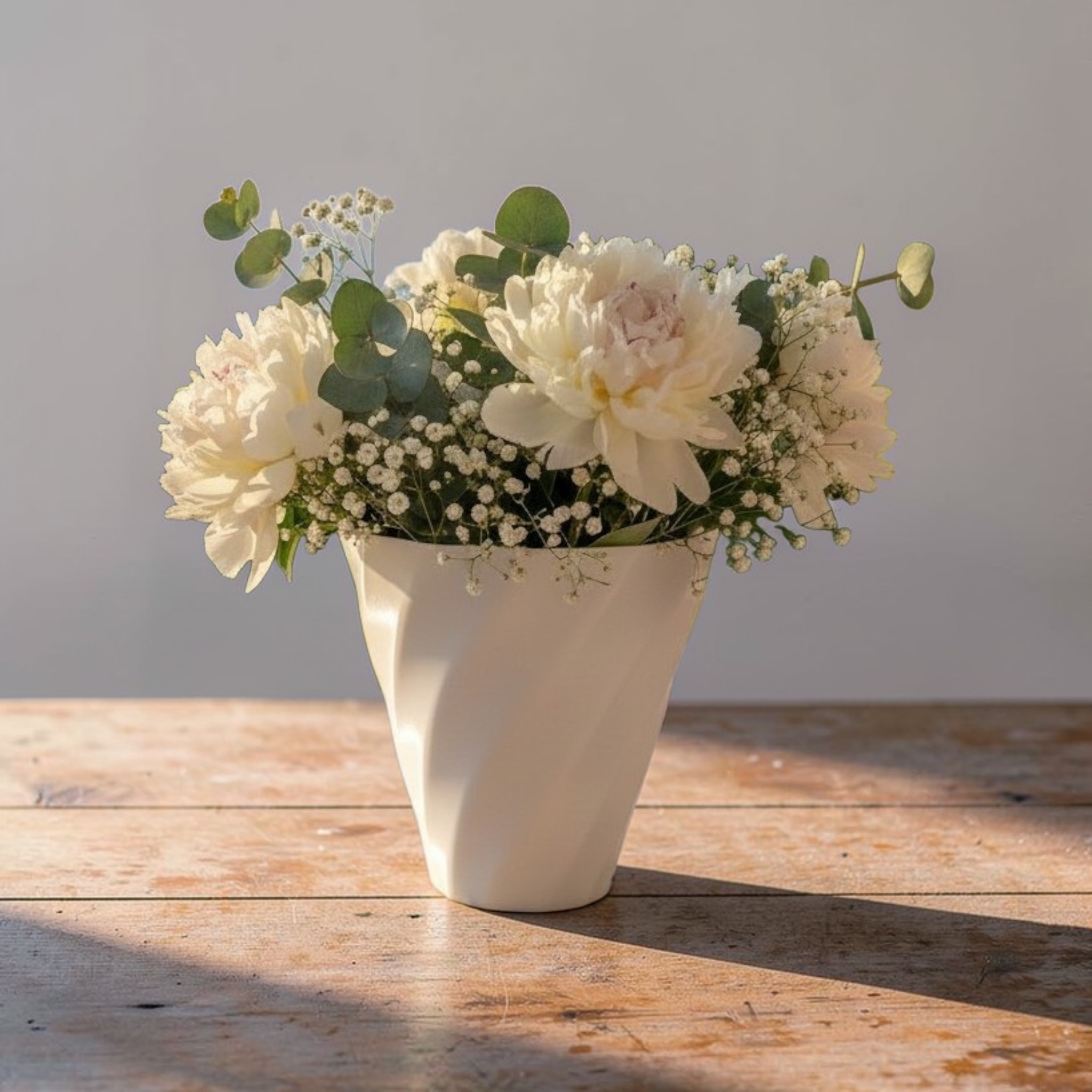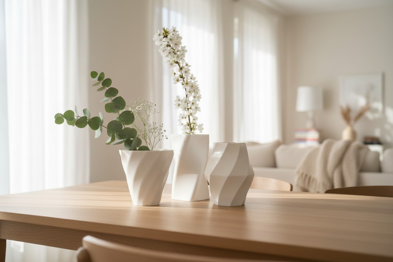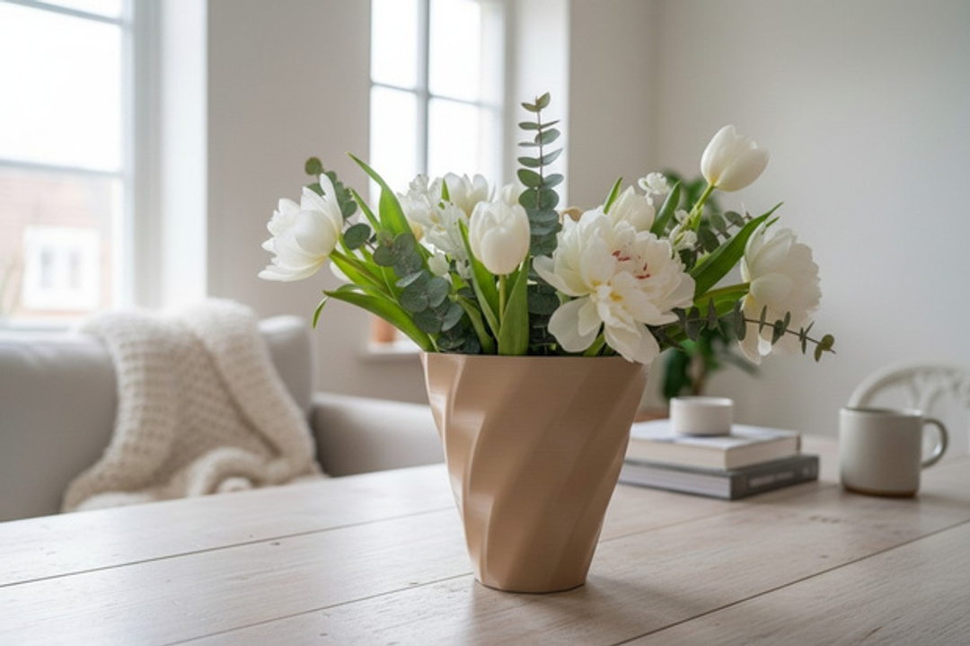 – Dekorative Vase, besonders geeignet für Trockenblumen oder als reines Dekoobjekt. Bitte beachten Sie, dass 3D-gedruckte Vasen ohne zusätzliche Beschichtung nicht vollständig wasserdicht sein müssen.