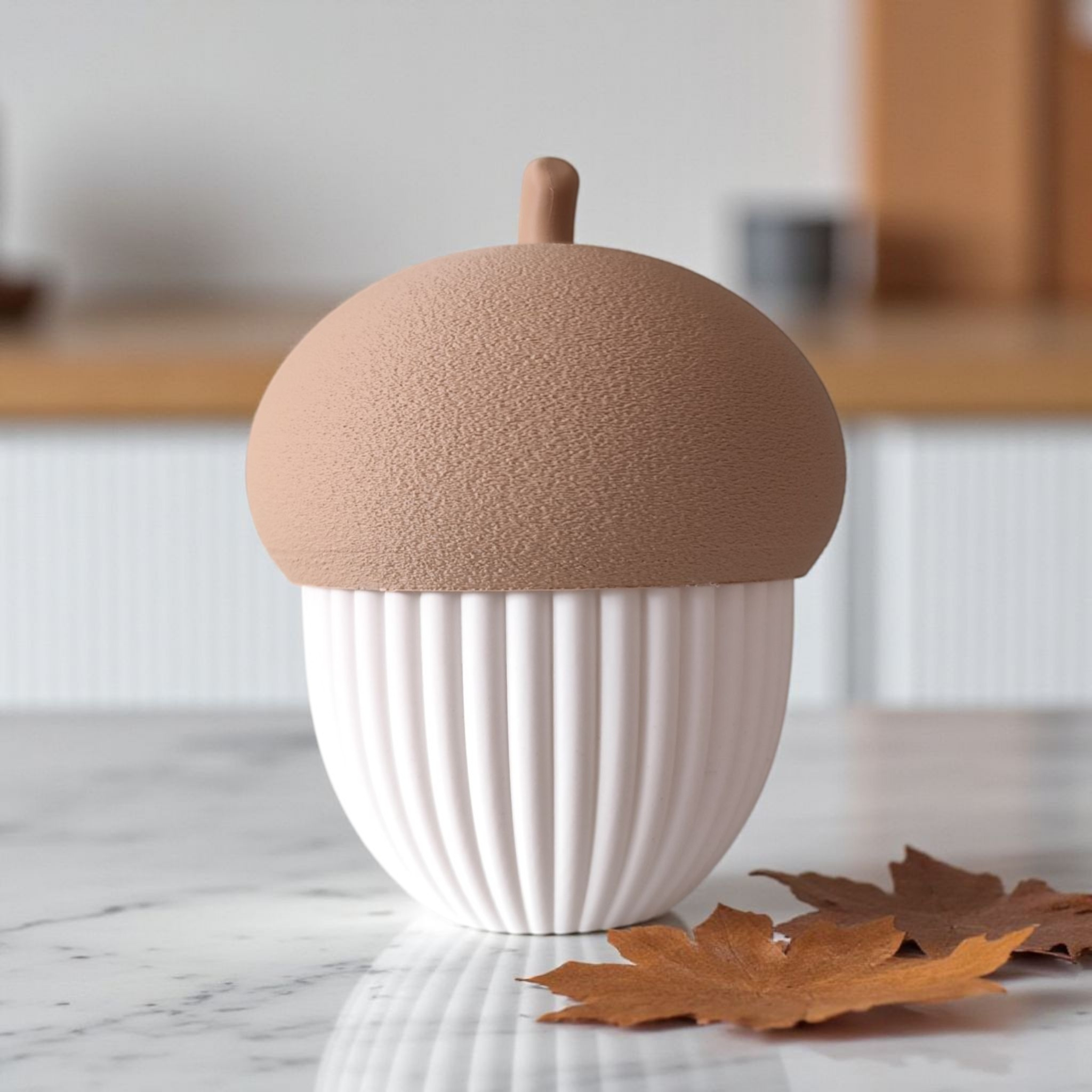 Dieser gerippte Eichelbehälter wurde im FDM-3D-Druck hergestellt und eignet sich ideal als herbstliche Dekoration, kleine Aufbewahrungsdose für Süßigkeiten oder stimmungsvolle Beleuchtung mit einem LED-Teelicht. Der Behälter wird komplett montiert geliefert und verfügt über einen abnehmbaren Deckel, sodass Innenraum und LED-Teelicht leicht zugänglich sind.