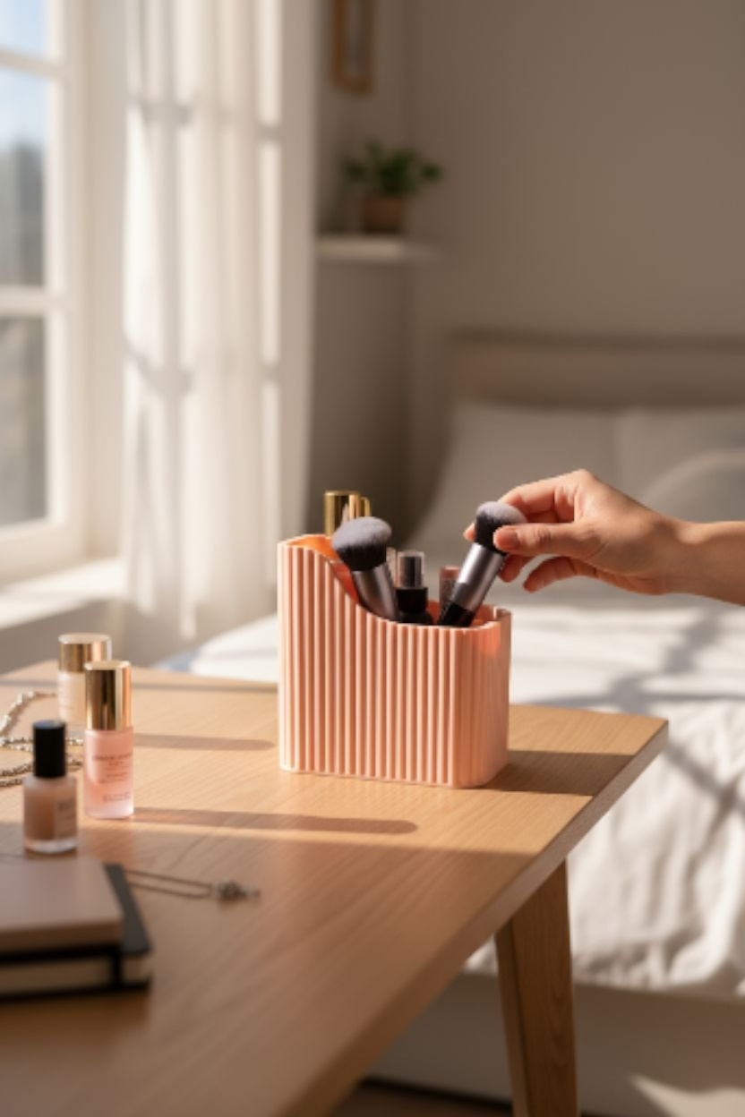 Dieser gerippte Make-up-Organizer wurde im FDM-3D-Druck gefertigt und bietet sechs praktische Fächer für Ihre täglichen Kosmetikartikel. Das kompakte Format von 207 × 138 × 137 mm macht ihn zum platzsparenden Helfer auf Schminktisch oder Badablage. Das gerippte Design verleiht dem Organizer einen dezenten Retro-Charakter im Stil der 1950er/60er Jahre und sorgt für eine elegante Optik.