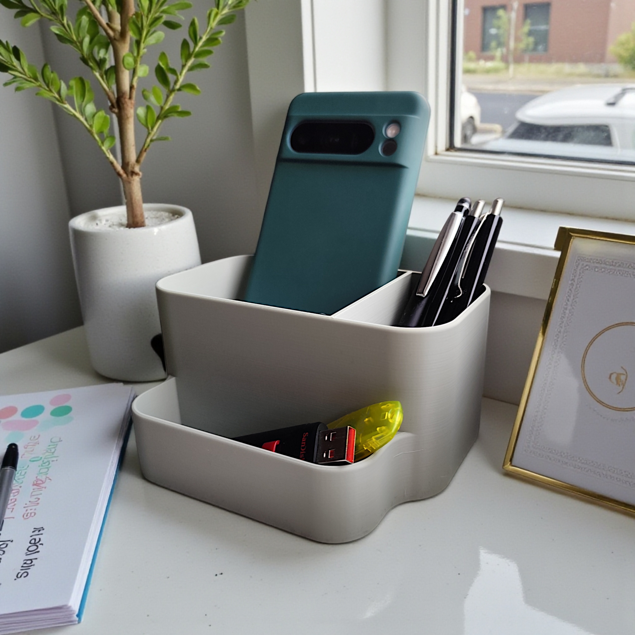 Dieser geschwungene Büro‑Organizer kombiniert schlichtes Design mit praktischer Funktionalität. Er bietet separate Fächer für Smartphone, Stifte, USB‑Sticks und Visitenkarten, sodass Ihre wichtigsten Arbeitsutensilien ordentlich und griffbereit auf dem Schreibtisch liegen.