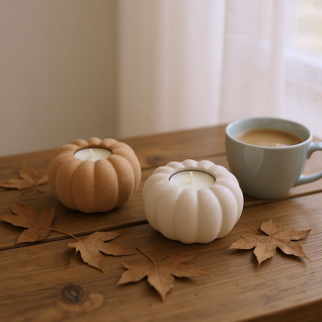 Dieser herbstliche Kürbis-Teelichthalter bringt saisonales Flair auf Tisch oder Fensterbank. Das kompakte Dekostück hat die Außenmaße 92×92×50 mm und nimmt Teelichter mit bis zu 40 mm Durchmesser auf. Die im Produktbild gezeigten Farbvarianten sind mattes Off‑White und Peanut (helles Erdnussbraun).