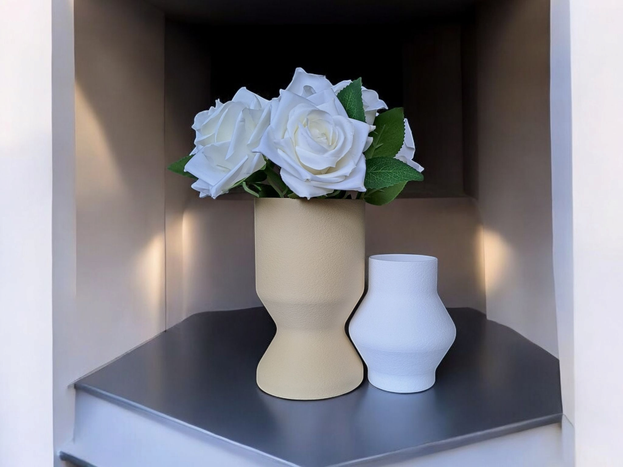 Dieses zweiteilige Vasen-Set „Interlocking Two“ verbindet klares, minimalistisches Design mit einem skulpturalen Zusammenspiel: Zwei Vasen greifen ineinander und ergeben zusammen eine harmonische Silhouette. Gefertigt im FDM 3D-Druckverfahren aus PLA, eignet sich das Set besonders für getrocknete Blumen und dekorative Arrangements. Für frische Schnittblumen empfehlen wir die Verwendung eines wasserdichten Einsatzes, da PLA-Objekte nicht immer dauerhaft dicht sind.