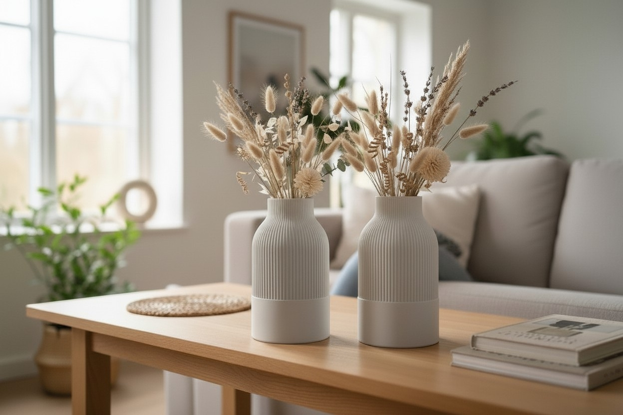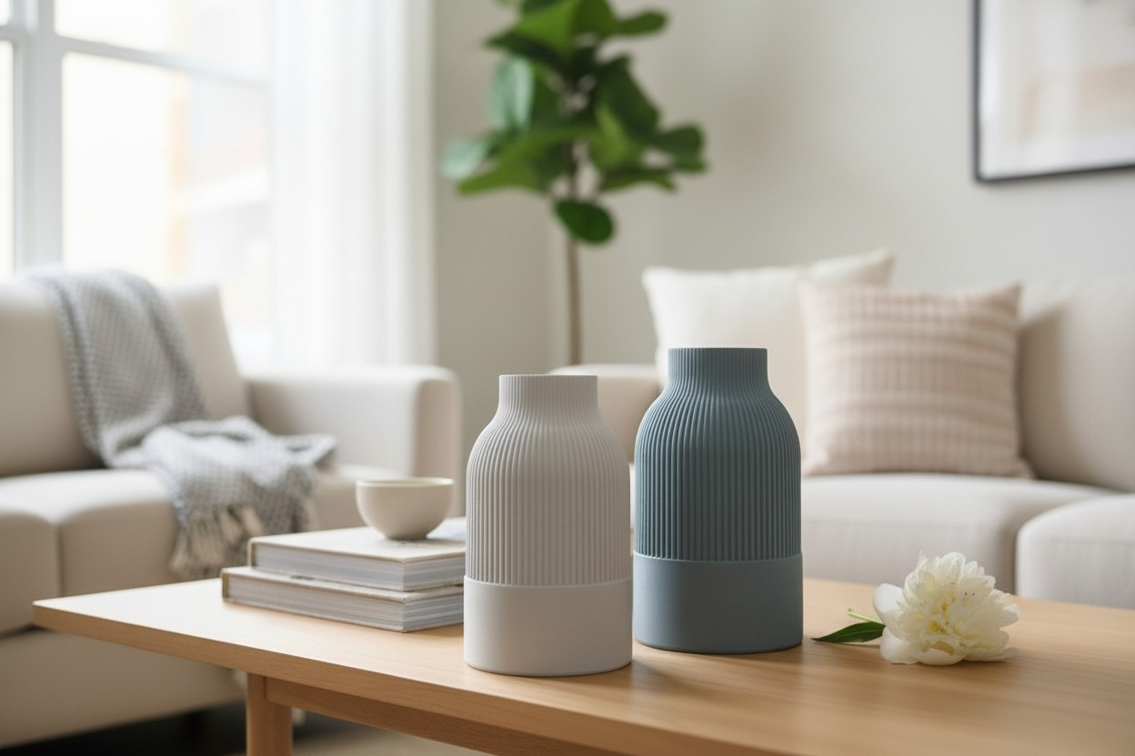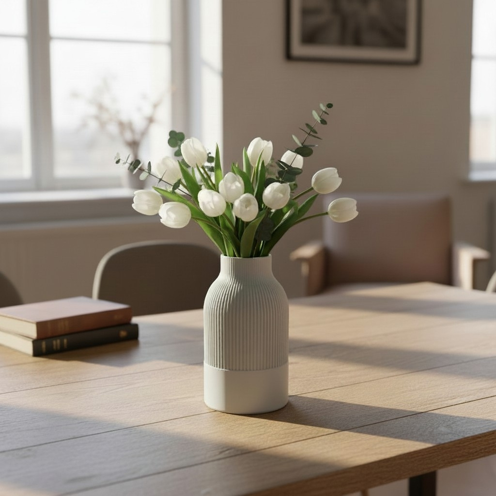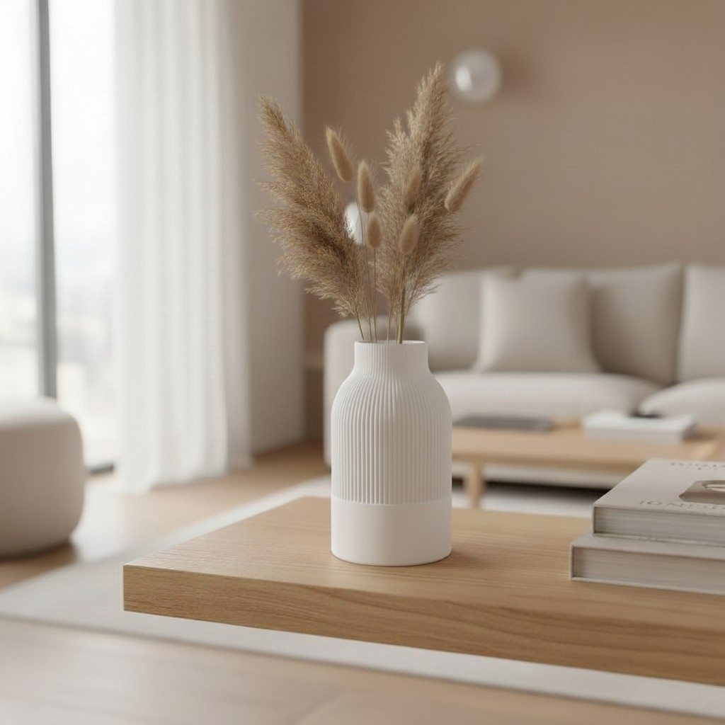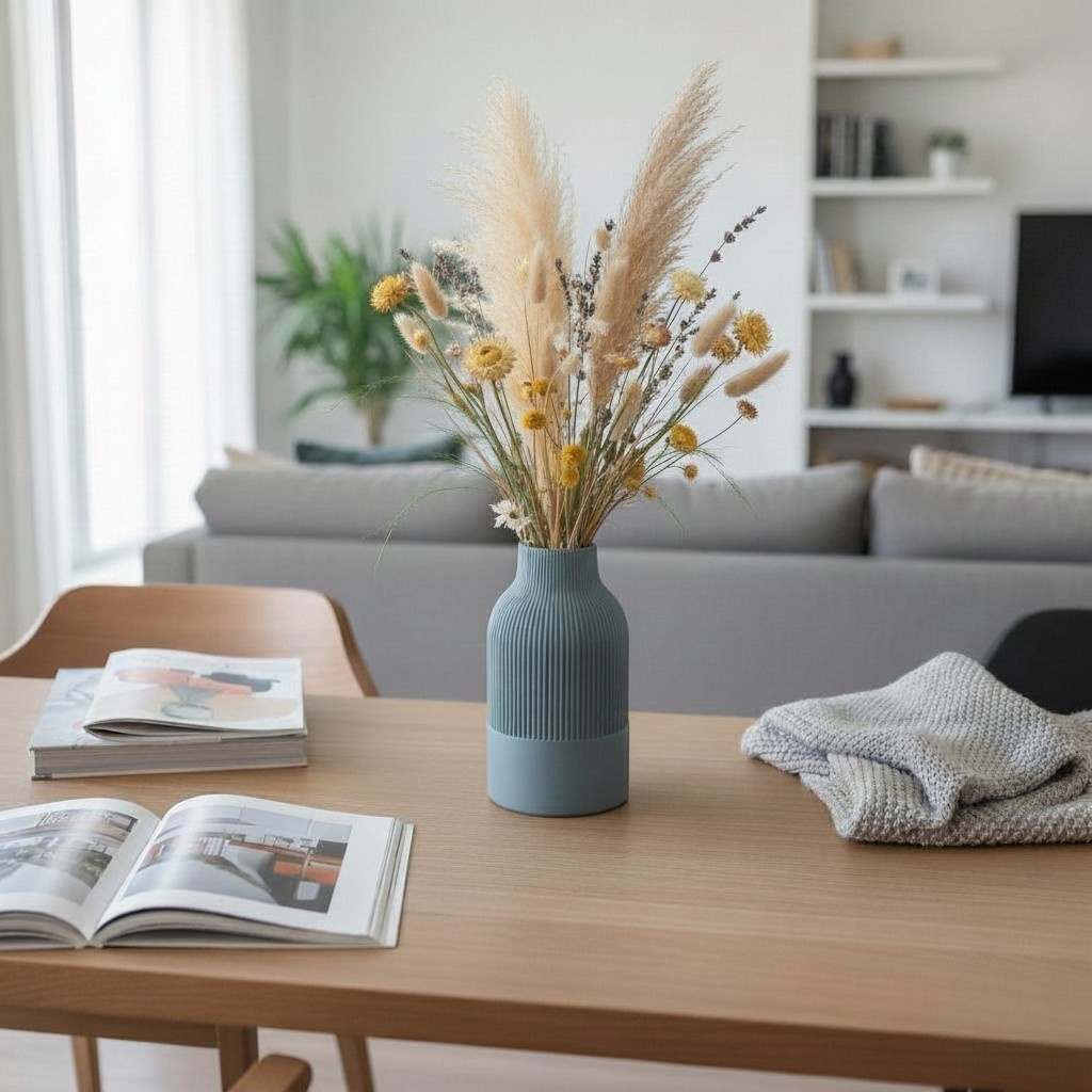Diese Vase im Japandi‑Design verbindet schlichte Linien mit dezenter Eleganz und wirkt als zurückhaltendes, zeitgemäßes Dekoobjekt. Die Vase wurde im FDM‑3D‑Druckverfahren gefertigt und besteht aus PLA‑Kunststoff. Die Standardmaße betragen 175 × 104 × 104 mm bei einem Filamentverbrauch von ca. 180 g. Die gezeigten Exemplare sind in Weiß und Pastellblau ausgeführt (siehe Produktbilder).