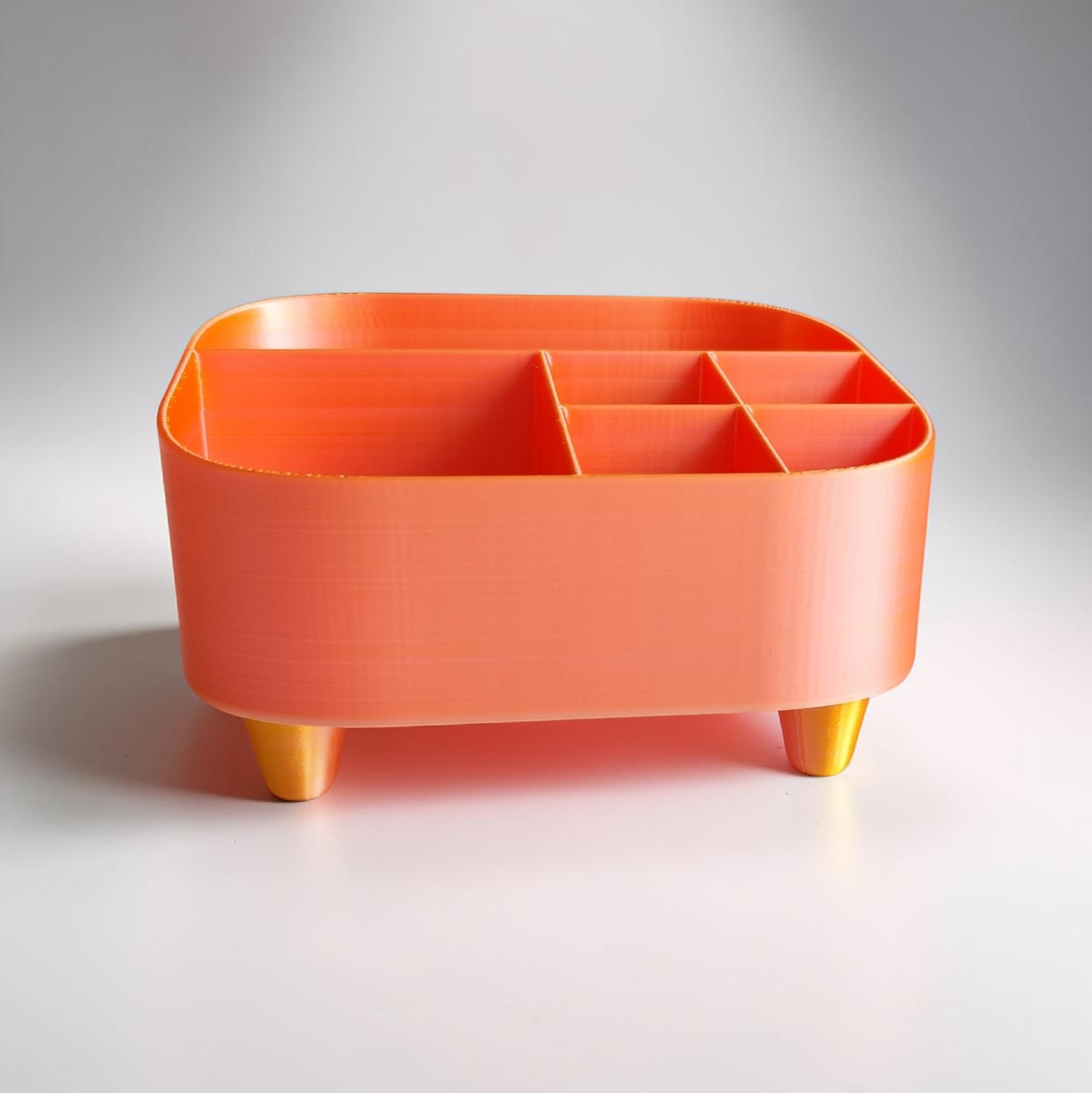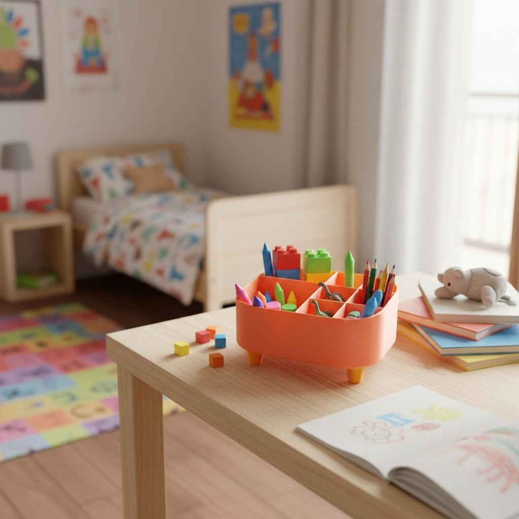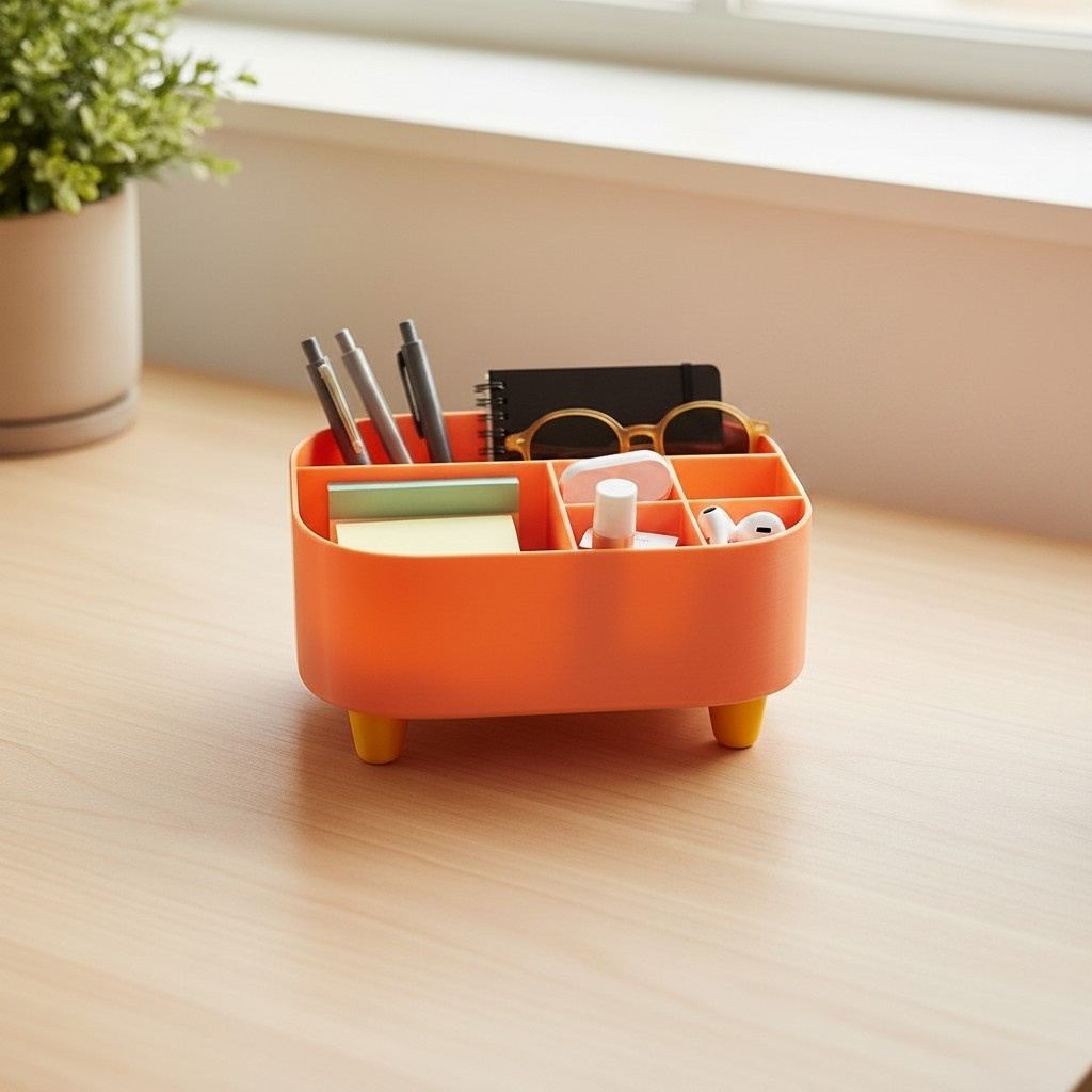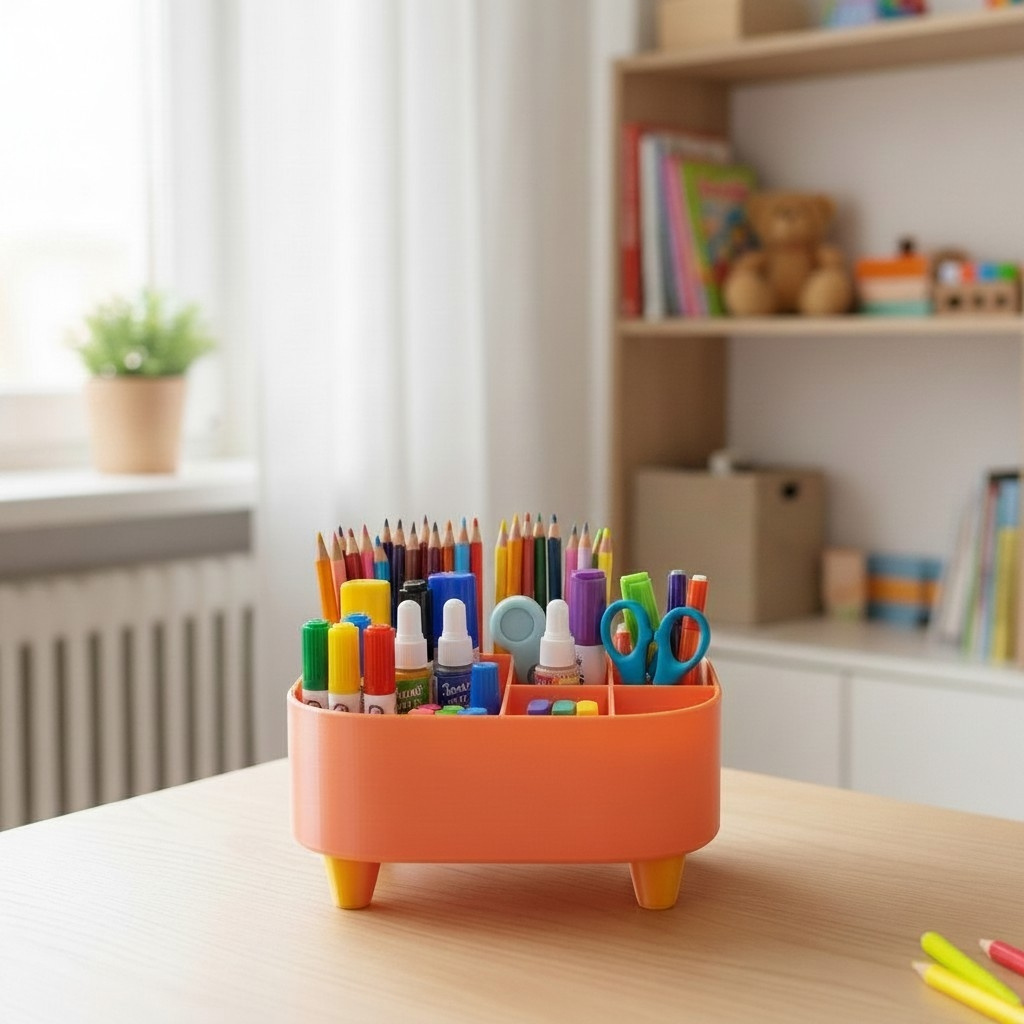 Praktischer, dekorativer Organizer in kompakter Ausführung – ideal zur Aufbewahrung von Stiften, Schminke, Kleinteilen oder Spielzeug im Kinderzimmer. Der Organizer steht auf vier gestalteten Füßen (als separate Elemente ausgeführt) und bietet durch seine Abmessungen von 175 × 140 × 100 mm genügend Platz für den täglichen Bedarf, ohne viel Stellfläche zu beanspruchen. Gefertigt aus PLA-Kunststoff, ist das Produkt leicht und formstabil. Durch das schlichte, freundliche Design passt es in unterschiedliche Einrichtungsstile und eignet sich gut als Ordnungshilfe auf Schreibtisch, Waschplatz oder Regal.