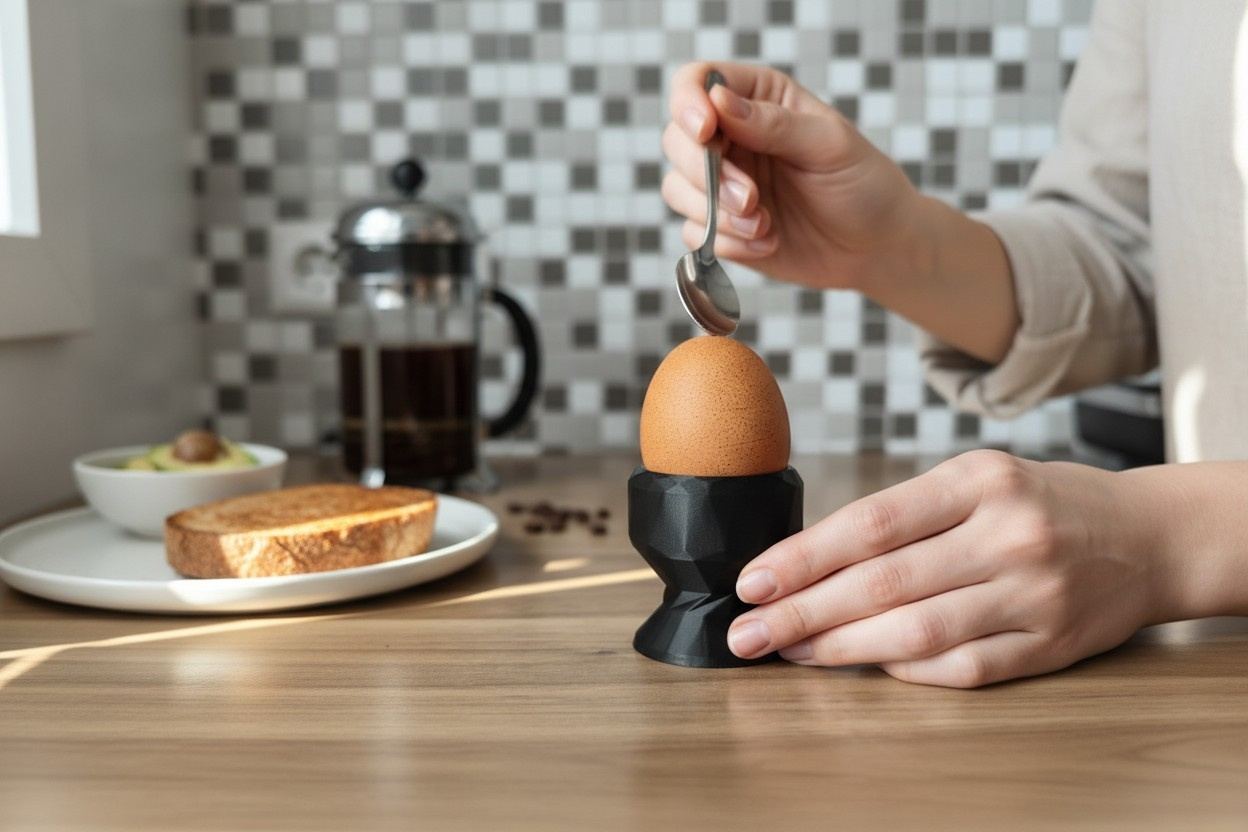 Dieses Exemplar wurde in PLA gefertigt (Farbe: metallisch schwarz). PLA ist biologisch abbaubar, bietet eine gute Oberflächenqualität, ist jedoch weniger hitze- und UV‑beständig als einige andere Kunststoffe. Bitte vor direkter Sonneneinstrahlung und anhaltender Wärme schützen; zur Reinigung empfehlen wir Handwäsche. Hinweis: Bei Ausführung aus PETG wäre der Eierbecher spülmaschinengeeignet.