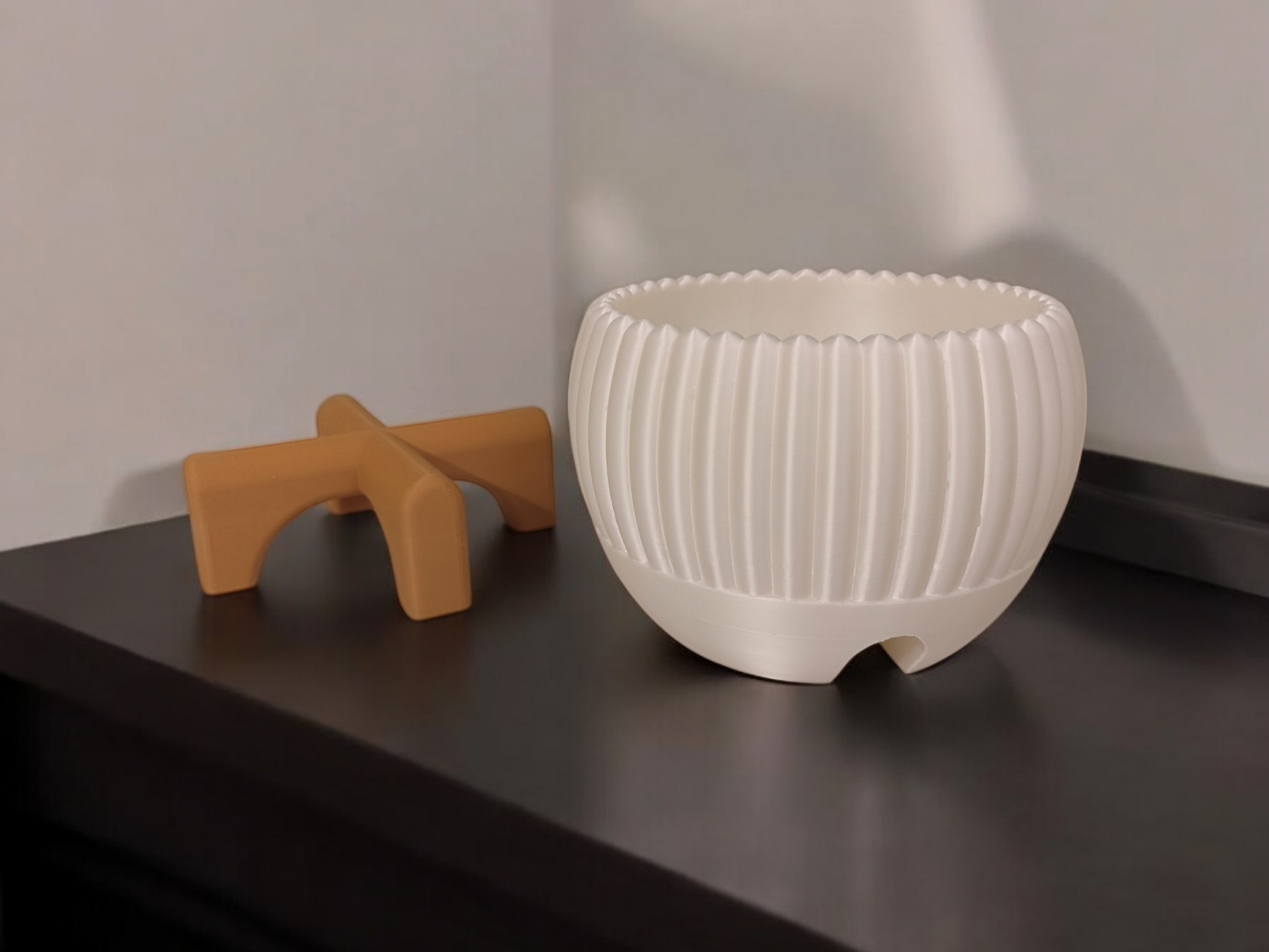 Das Gefäß ist 3D gedruckt aus PLA und wird montiert geliefert. Abmessungen (zusammengebaut): 170 × 150 mm. Der separate Stand mit vier Beinen hebt den Topf optisch an und lässt ihn wie ein kleines Möbelstück wirken. Für den Gebrauch mit Pflanzen empfehlen wir, bei Bedarf eine passende Unterlage oder Einsatzschale zu verwenden, um Wasser und Erde aufzunehmen. Luma ist eine dezente, aber wirkungsvolle Ergänzung für Fensterbank, Sideboard oder kleineren Pflanzbereich.