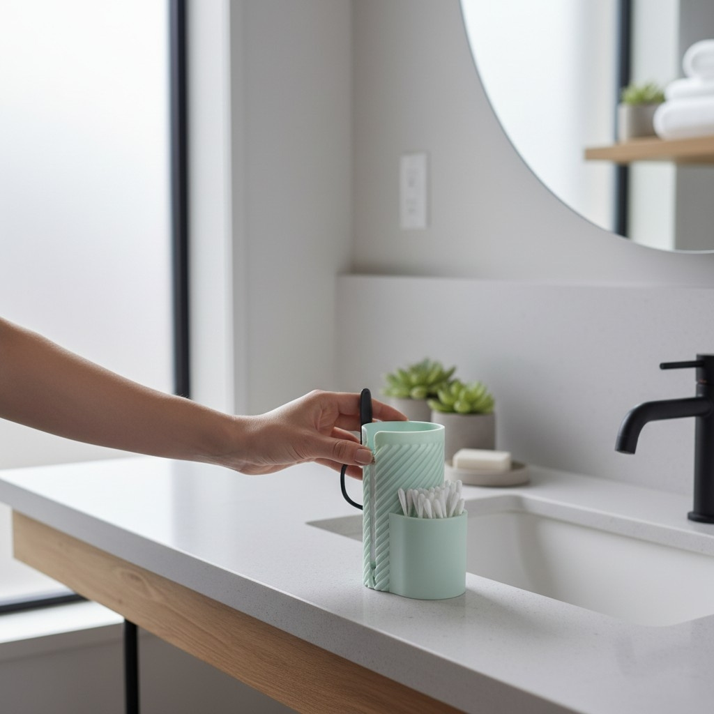 MakeUpMate 2.0 ist ein kompakter Organizer für Badezimmer und Schminktisch, der zusätzlichen Platz für Nagelschere und Nagelfeile bietet. Das praktische Stecksystem und mehrere Fächer machen ihn ideal zur Aufbewahrung von Pinseln, Lippenstiften, Eyelinern und kleinen Pflegewerkzeugen.