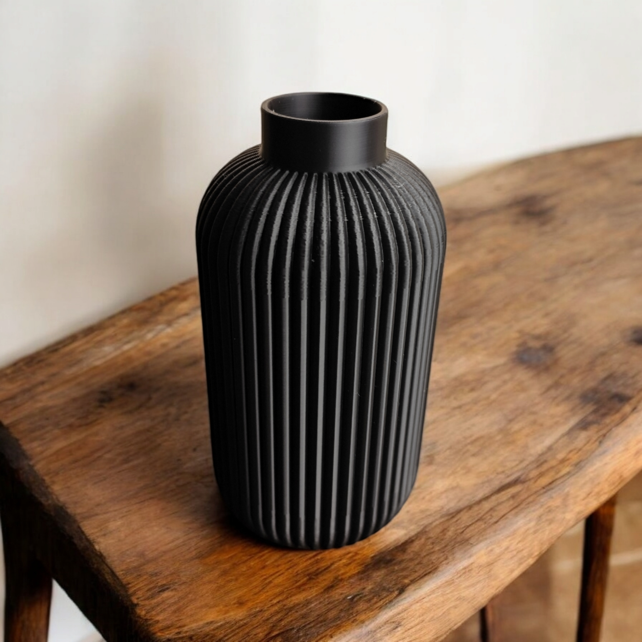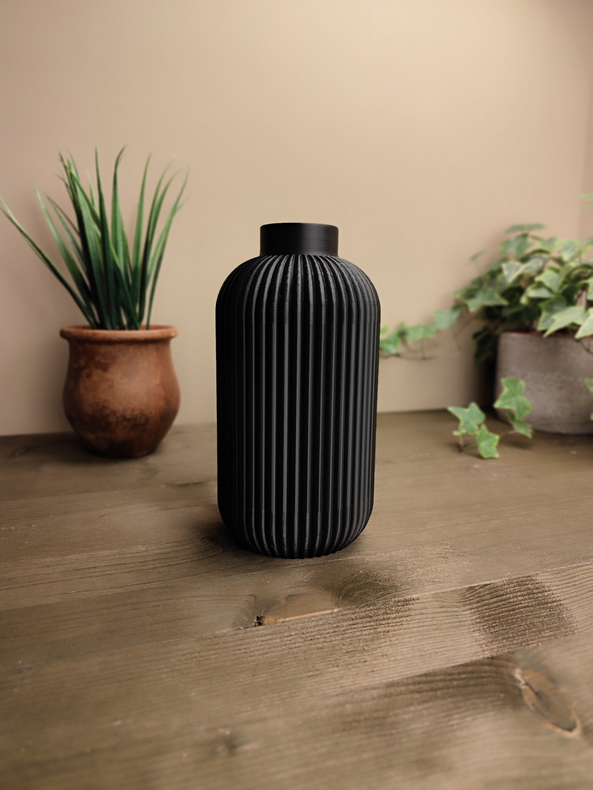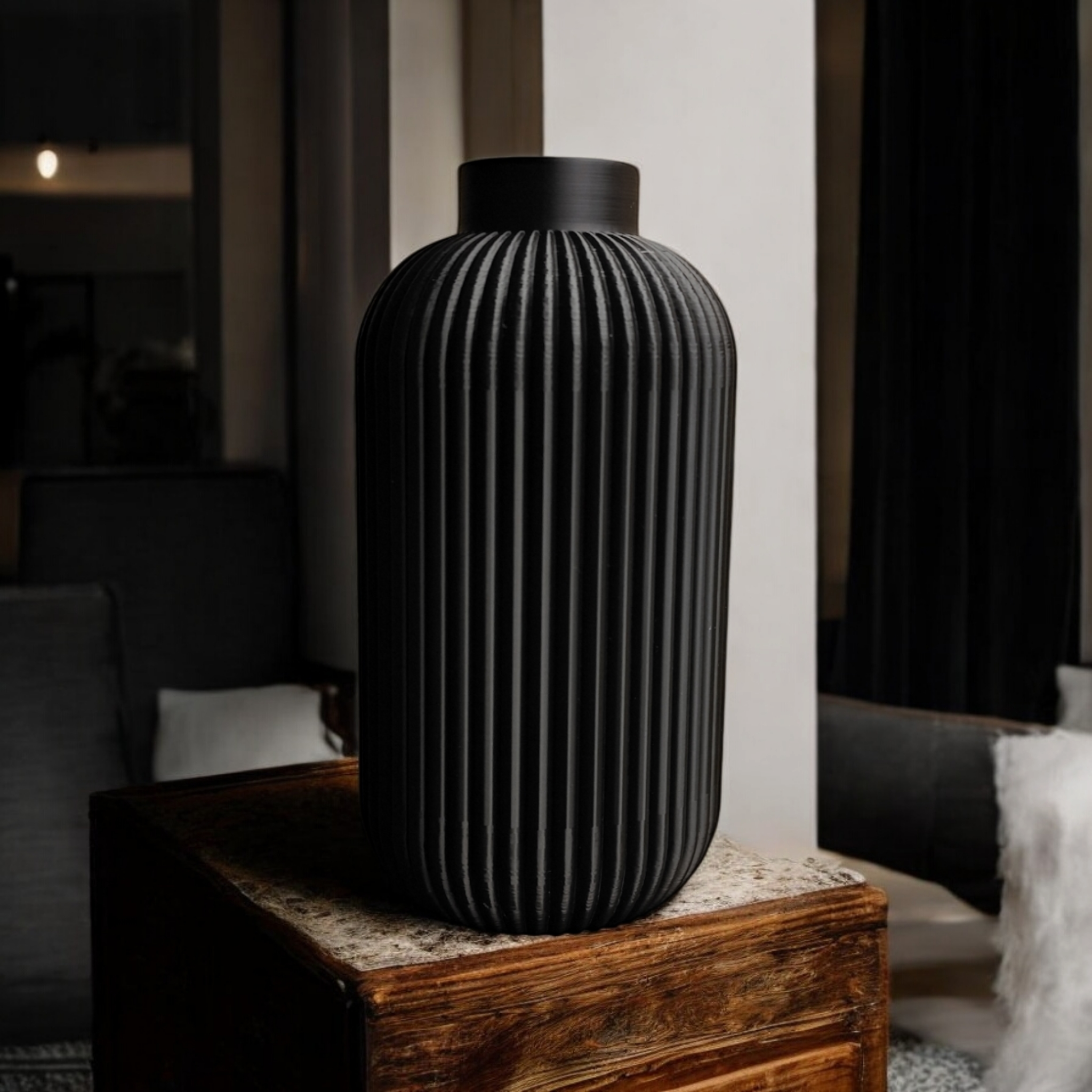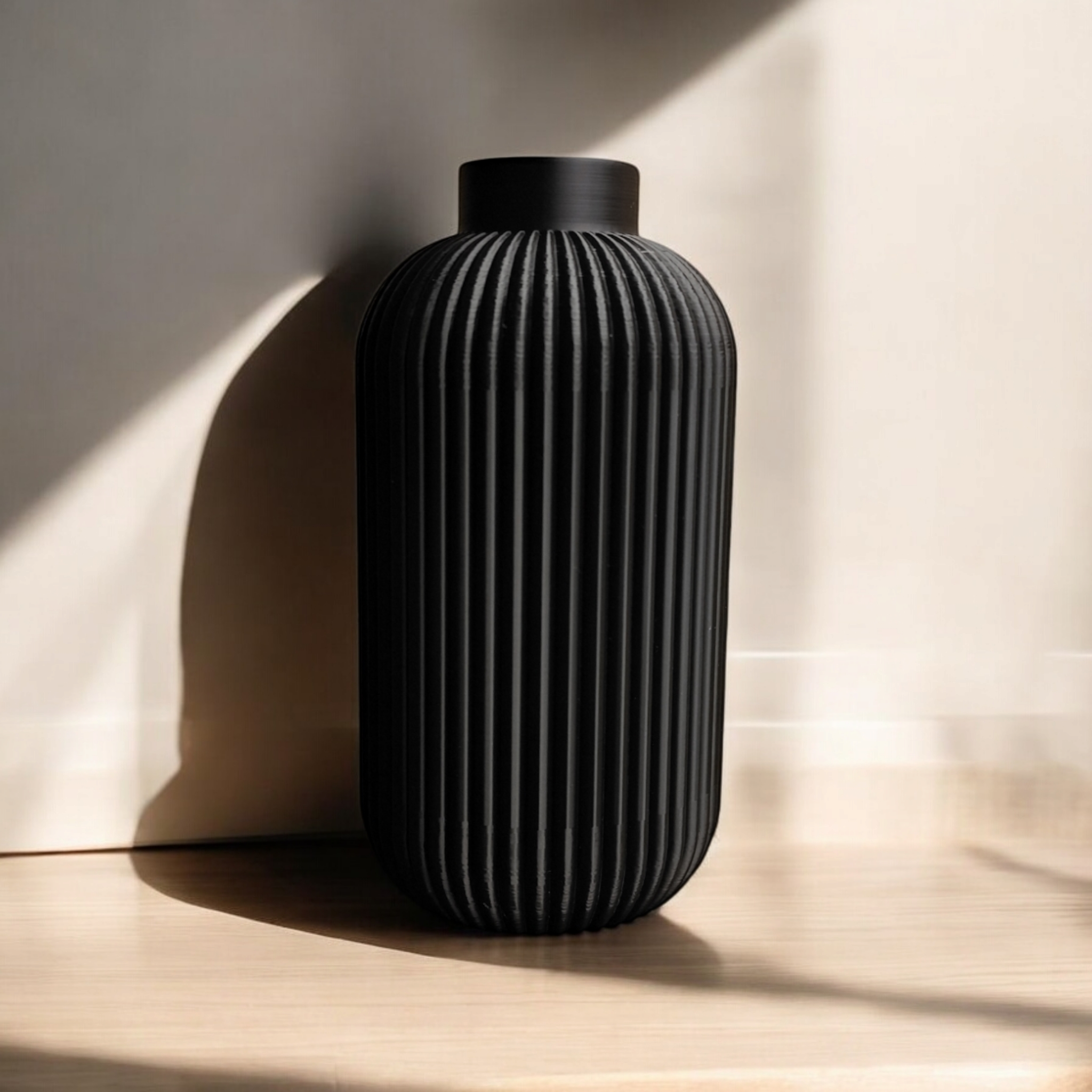 Diese gerippte, minimalistische Vase wurde im FDM-3D-Druck gefertigt und besticht durch ihr schlichtes, modernes Design sowie feine Rippenstrukturen. Das Produkt wurde ohne Stützstrukturen gedruckt. Standardmaße: 183 × 95 × 95 mm (H × B × T). Die Farbgebung entnehmen Sie bitte dem Produktbild.