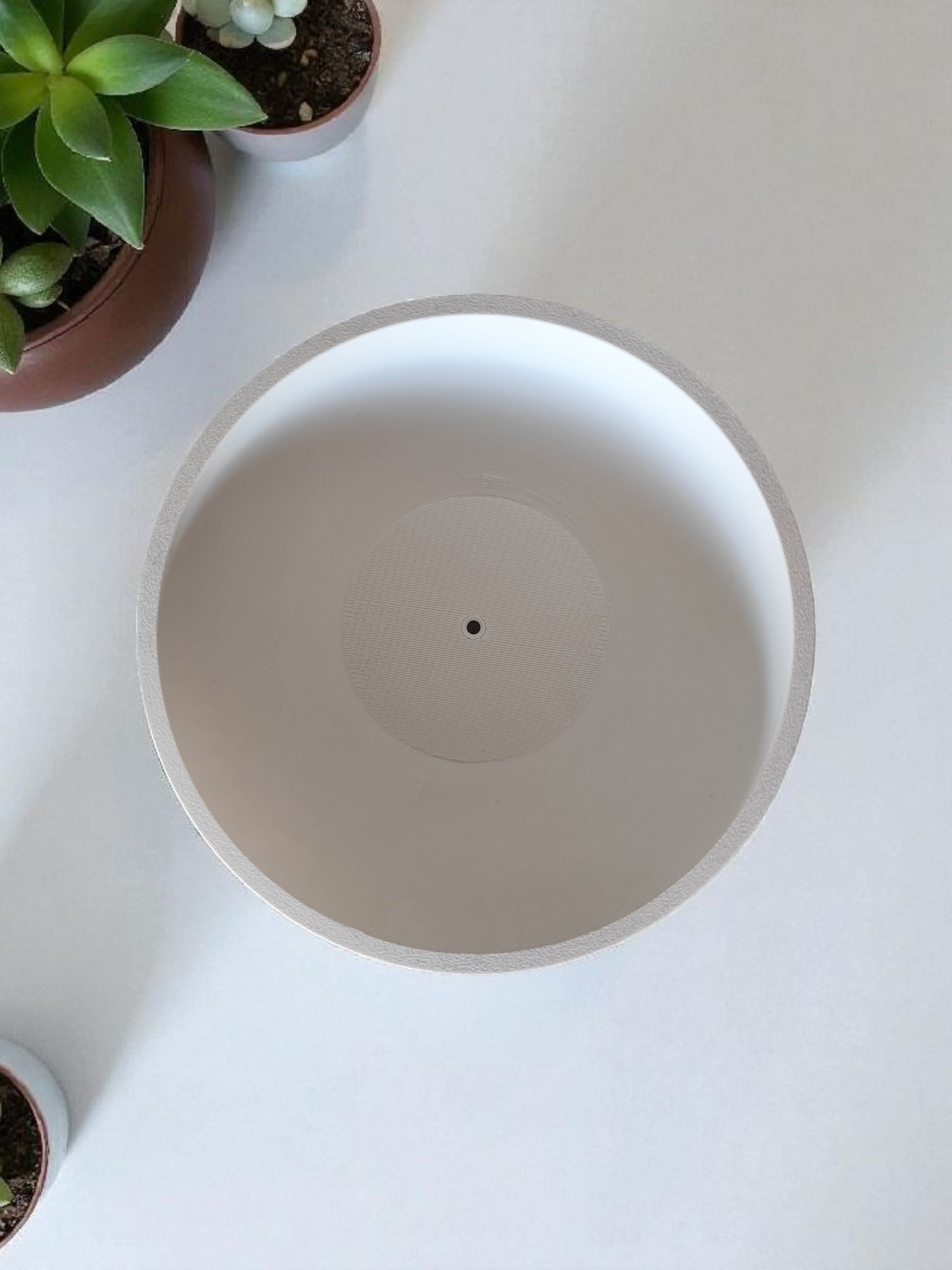 Material und Farbe: Der Topf ist aus PLA-Kunststoff gefertigt (weiß). PLA ist leicht zu verarbeiten und formstabil; vermeiden Sie jedoch dauerhafte direkte Sonneneinstrahlung und hohe Temperaturen, da dies zu Verformungen oder Farbveränderungen führen kann. Die tatsächliche Farbwirkung entnehmen Sie bitte den Produktbildern.