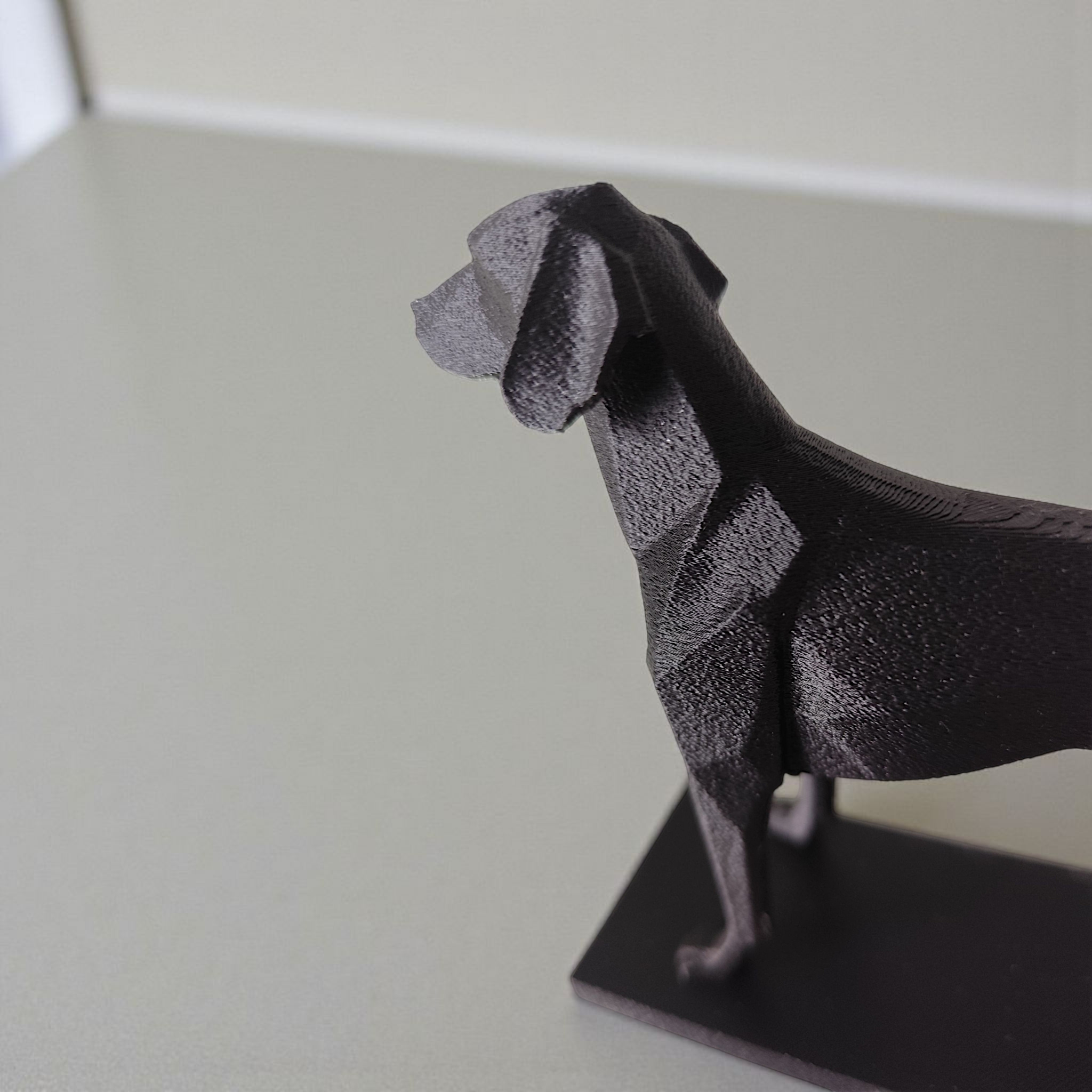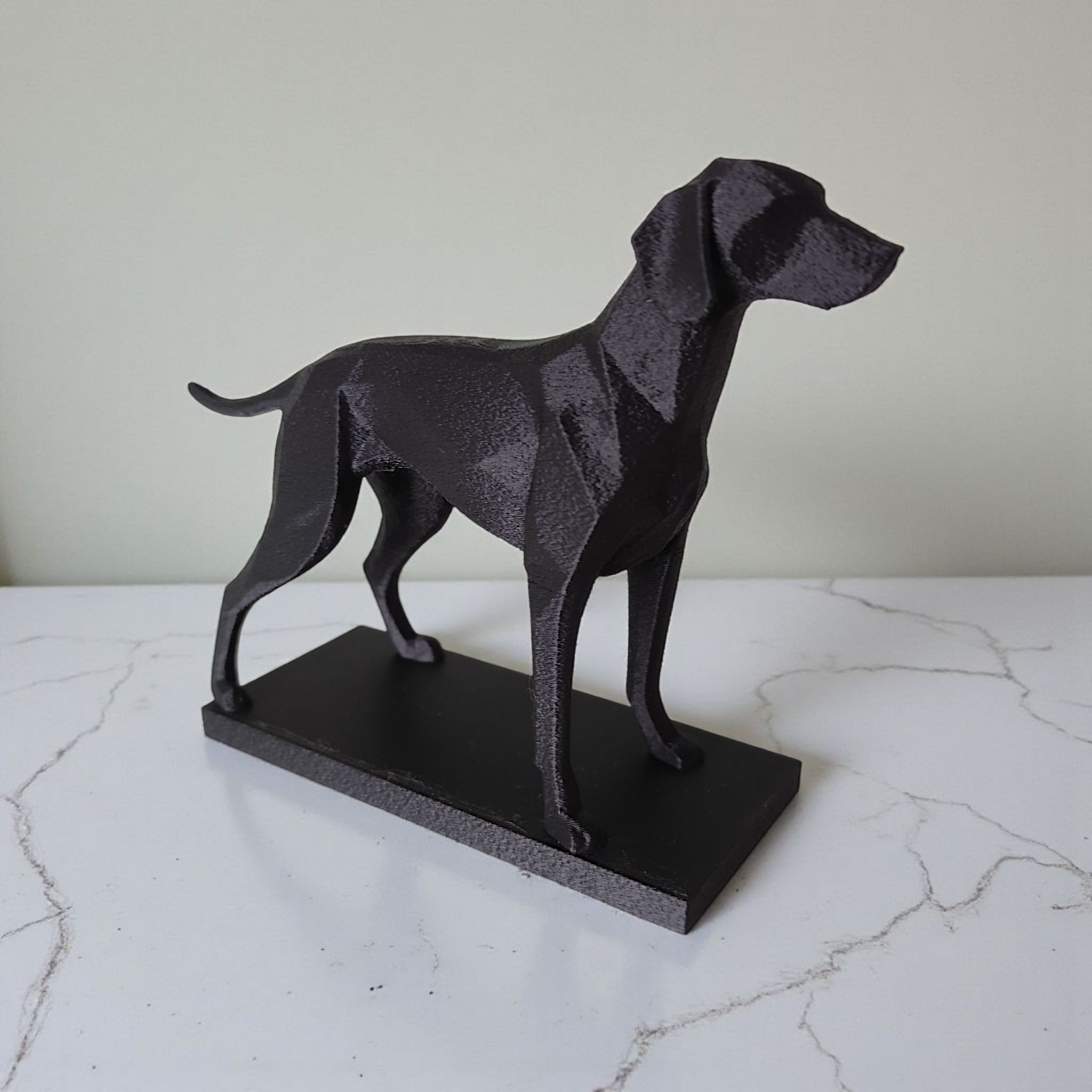 Dekorative Low‑Poly Figur eines Jagdhundes, 3D‑gedruckt im FDM‑Verfahren. Diese minimalistische Skulptur besticht durch klare, kantige Formen und eignet sich als stilvolle Deko für Regal, Fensterbank oder Schreibtisch.