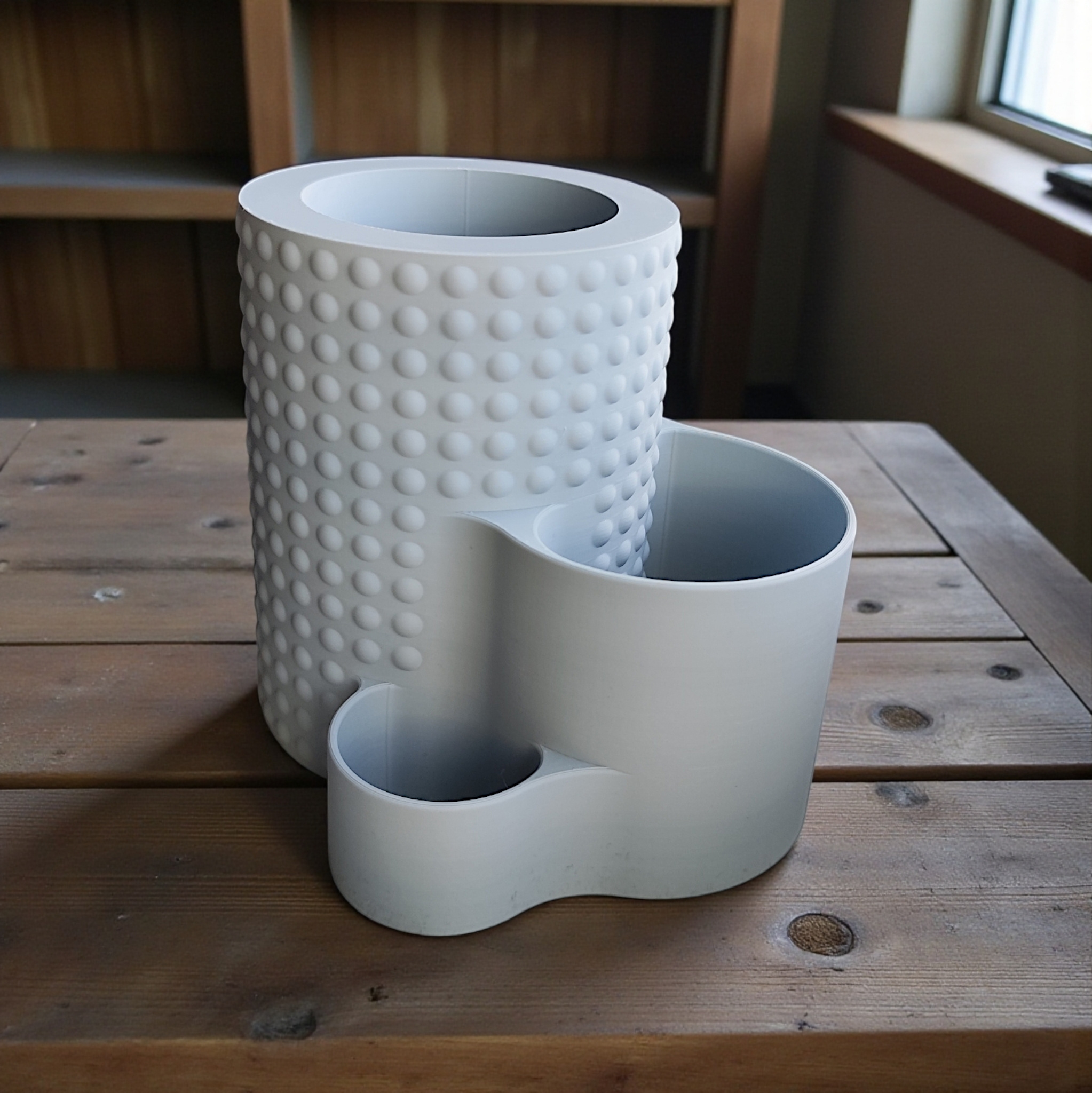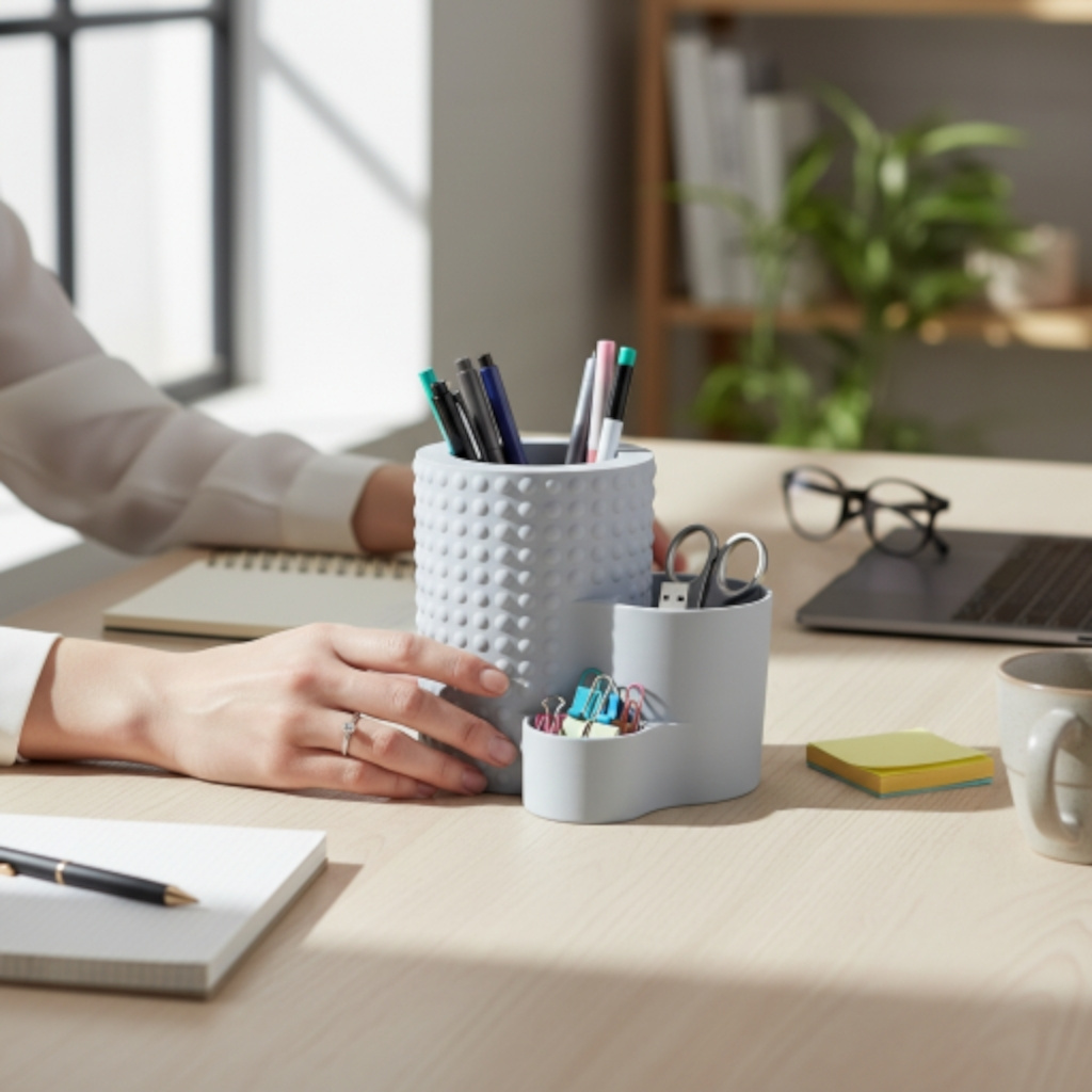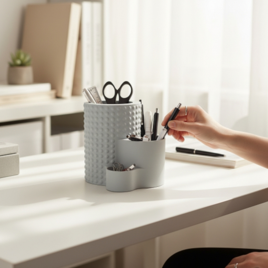 Dieser moderne Schreibtisch‑Organizer kombiniert klares Design mit hoher Funktionalität. Das auffällige Punktemuster an der großen Aufbewahrungsfläche und die extra dicken Wände verleihen dem Organizer eine saubere, hochwertige Optik und ein angenehmes Griffgefühl.