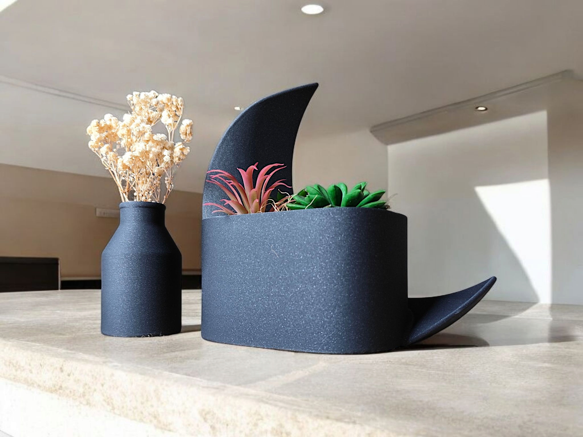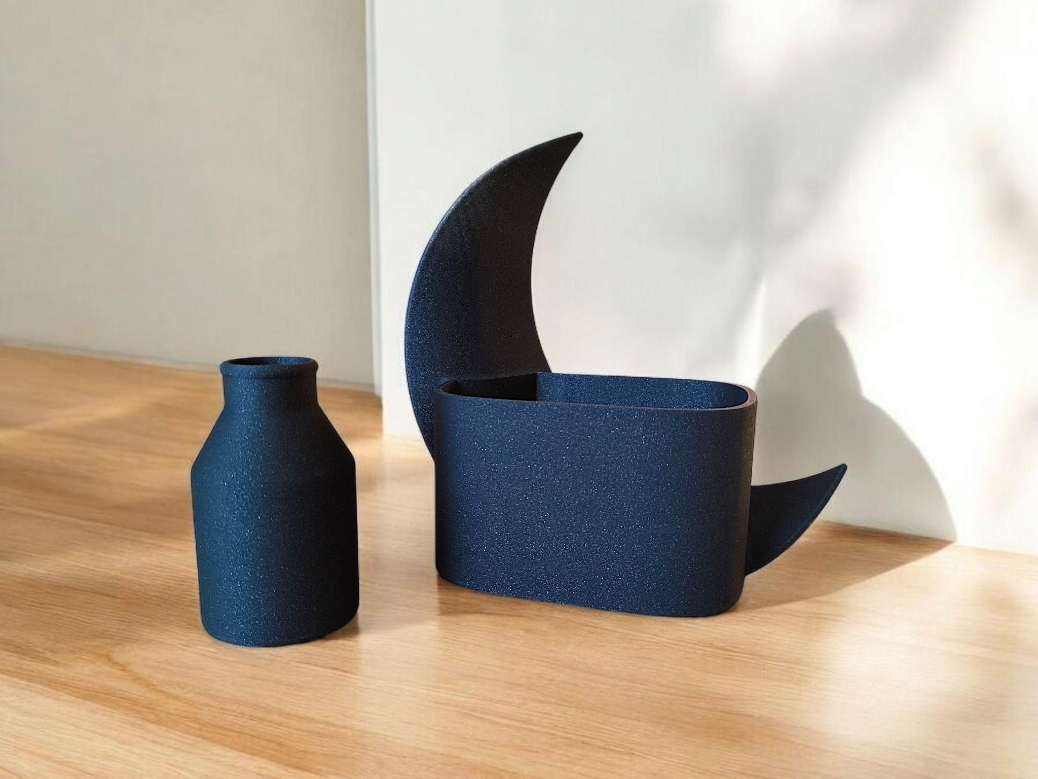 Dieses Moonlit Reverie Crescent Wohn-Deko-Set besteht aus einer halbrunden Pflanzschale, die sich ebenso als Teelichthalter eignet, und einer passenden Vase. Beide Teile sind fertig 3D gedruckt und bereit zur Platzierung in Wohnzimmer, Schlafzimmer oder auf dem Balkon (geschützte Lage). Das Design erinnert an eine Mondsichel und bringt ein dezentes, stimmungsvolles Element in Ihre Einrichtung.