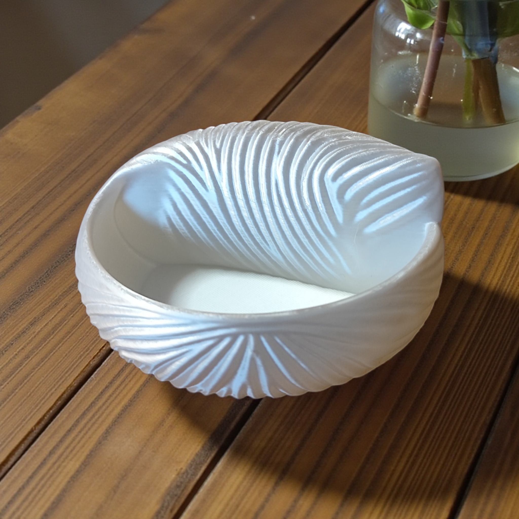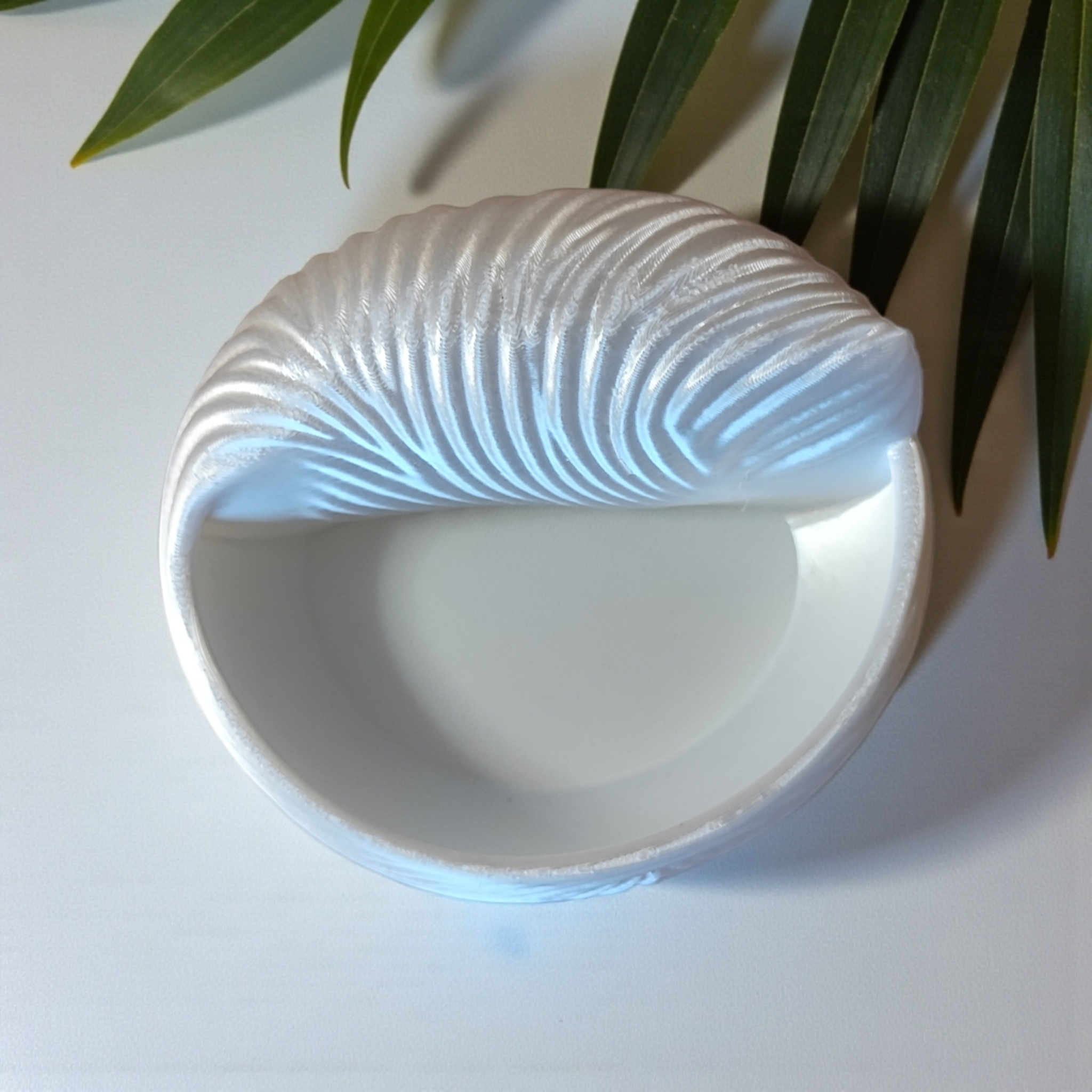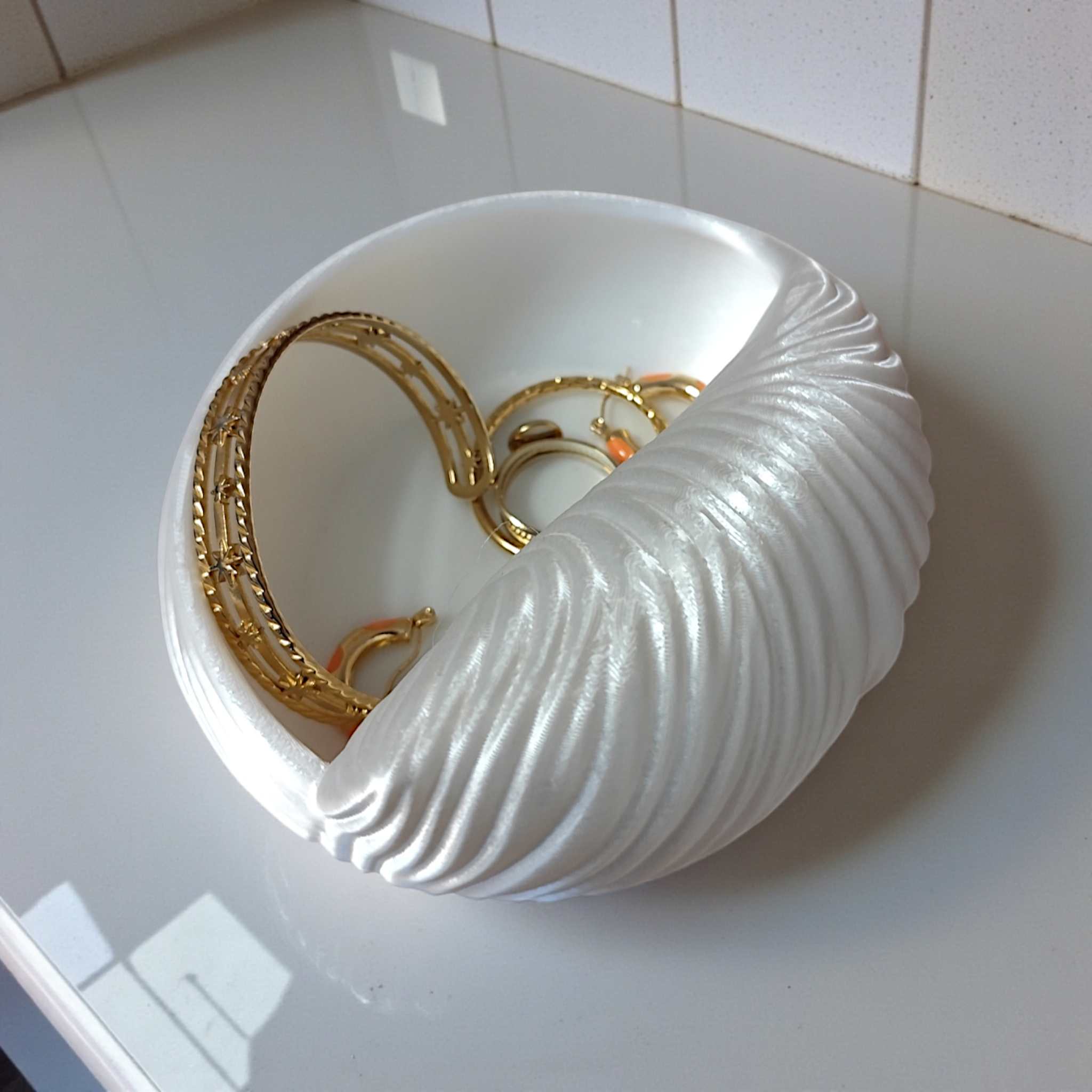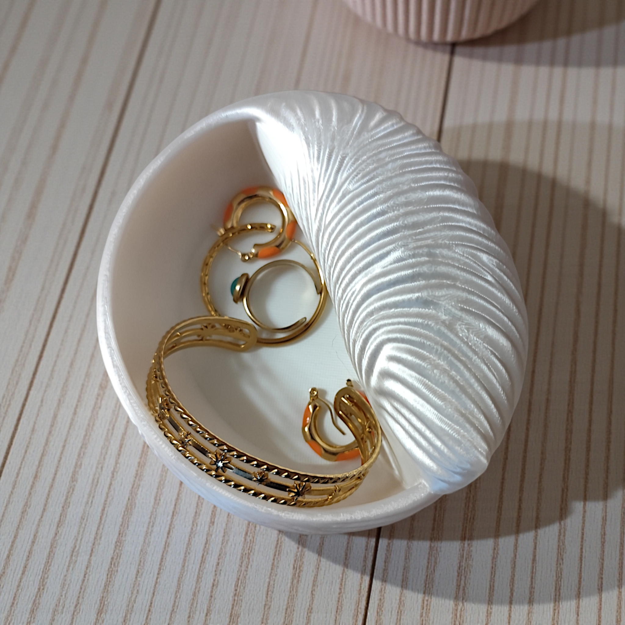 Elegante, handliche Schmuckschale in Muscheloptik, fertig 3D-gedruckt und sofort einsatzbereit. Die Schale eignet sich ideal zur Aufbewahrung von Ringen, Ohrschmuck oder kleinen Accessoires auf dem Nachttisch, im Bad oder auf dem Schminktisch. Maße: 120 × 111 × 50 mm (L × B × H). Material: PLA-Kunststoff, weiß mit leicht schimmerndem, perligem Erscheinungsbild. Bitte schützen Sie das Produkt vor dauerhafter Sonneneinstrahlung und starken Wärmequellen, da PLA unter Hitzeweichung oder Verfärbung leiden kann. Hergestellt im FDM-3D-Druckverfahren — dadurch können feine Schichtlinien oder minimale Unregelmäßigkeiten sichtbar sein; dies ist ein typisches Merkmal des Verfahrens und kein Reklamationsgrund. Pflegehinweis: Mit einem weichen, feuchten Tuch abwischen; nicht spülmaschinenfest. Farbe wie auf den Produktbildern dargestellt. Sie erwerben das fertige physische Produkt, nicht eine Druckdatei.