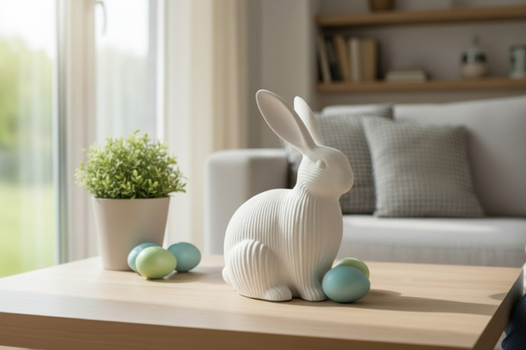 Dekorative Osterhase-Figur, fertig 3D-gedruckt (FDM-Verfahren) aus PLA. Dieses handliche Dekostück eignet sich ideal als saisonale Tisch- oder Regaldekoration und bringt ein freundliches Motiv in Ihr Zuhause. Die hier angegebene Größe entspricht dem Beispieldruck: 199 x 153 x 112 mm.