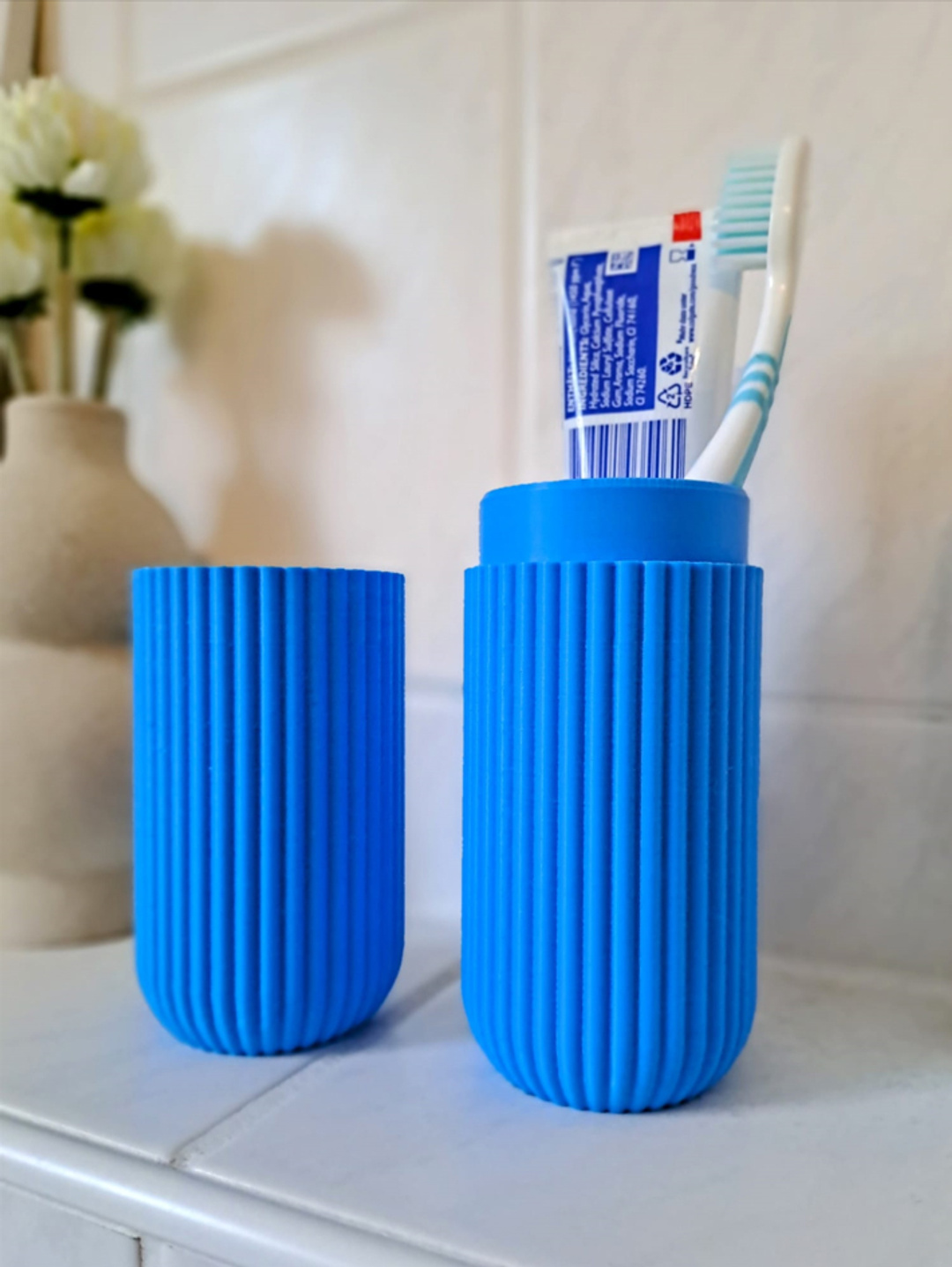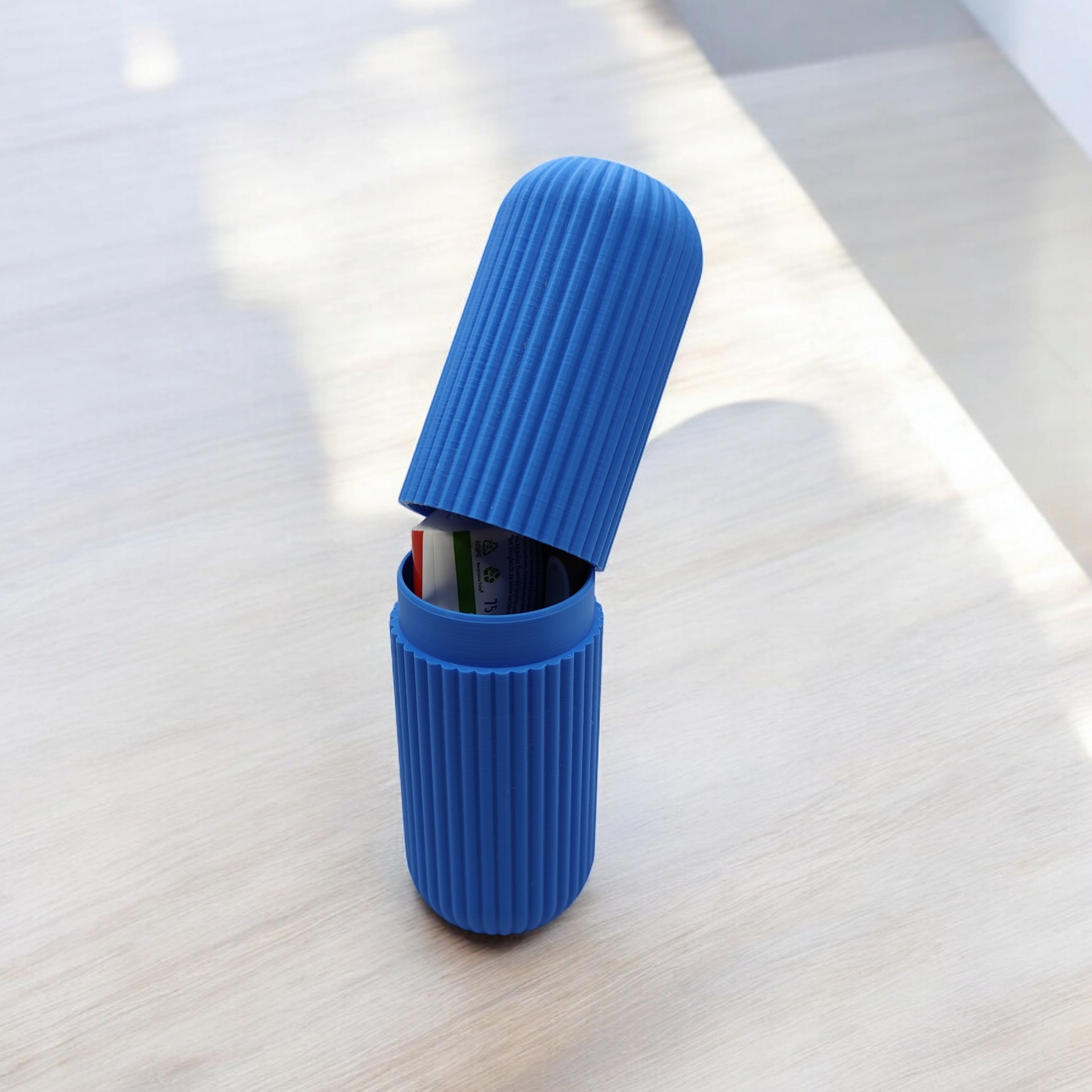 Praktisches Reiseetui für Zahnbürste und Zahnpasta in einem klaren, funktionalen Design. Die gerippte Oberfläche sorgt für guten Halt in der Hand oder in der Tasche, das robuste Gehäuse schützt Ihre Zahnbürste beim Transport.