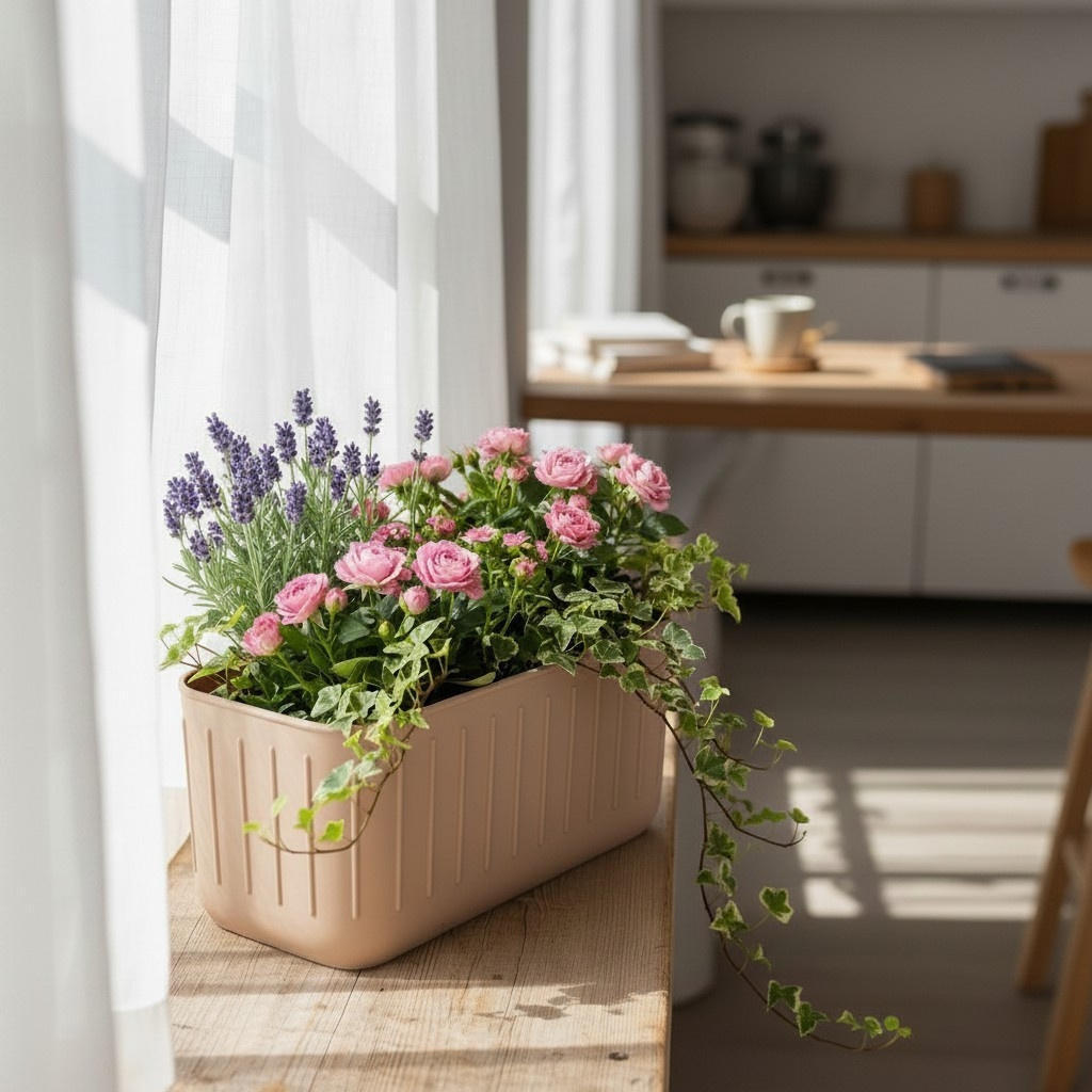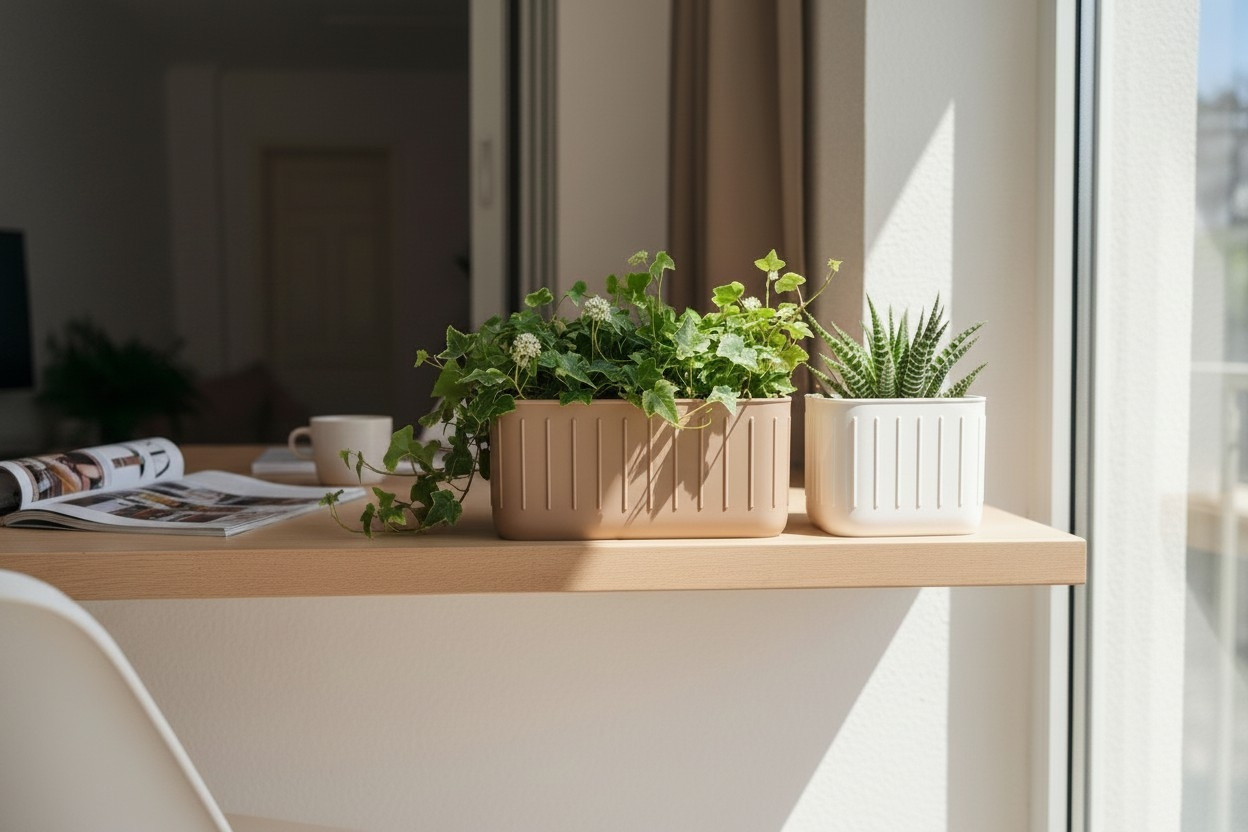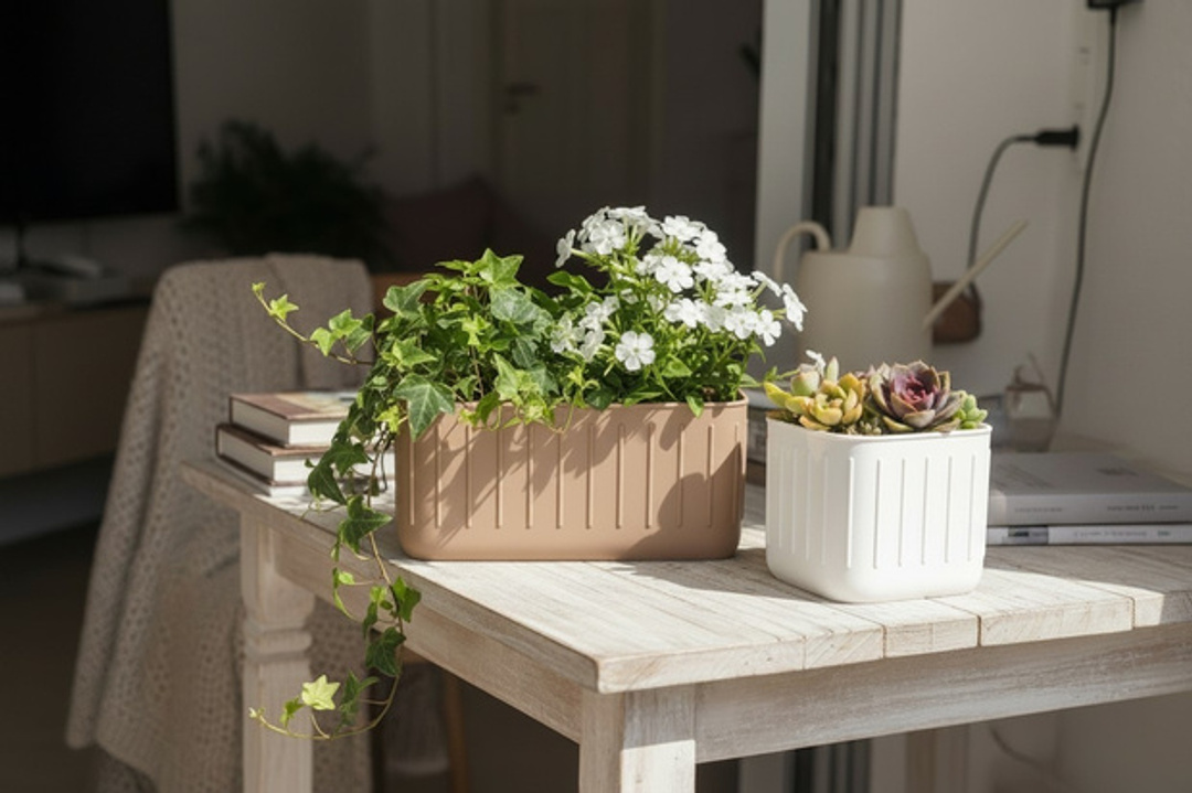 Die Töpfe sind für typische Zimmerpflanzen und Dekorationszwecke ausgelegt. Bei Nutzung mit Erde und Gießwasser empfehlen wir ein passendes Untersetzer oder eine Innenfolie, um stehendes Wasser und mögliche Feuchtigkeitseinwirkung auf die Kunststoffoberfläche zu reduzieren.