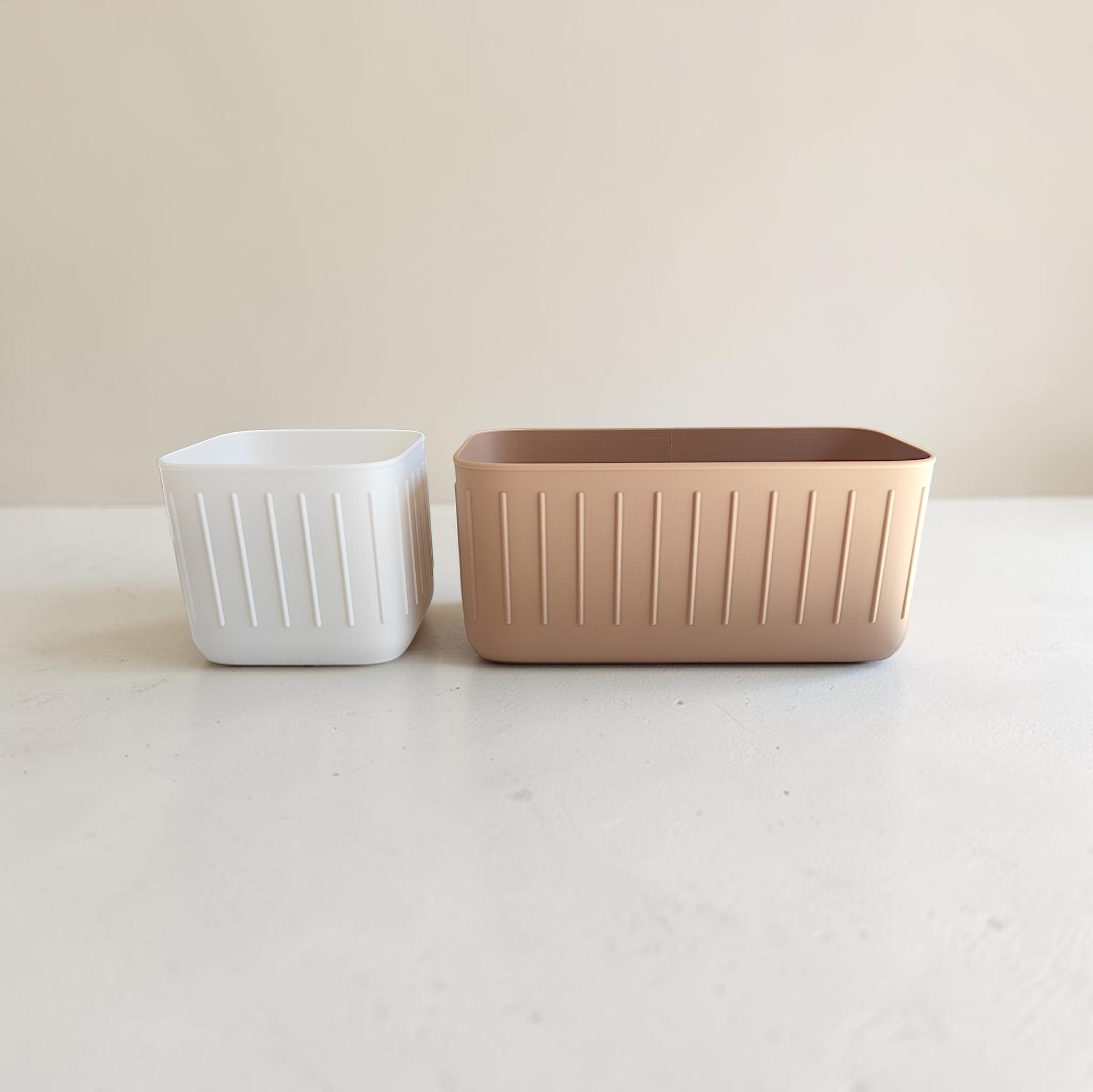 Stilvolles 2er-Set skandinavisch inspirierter Blumentöpfe, 3D gedruckt und fertig montiert. Das Set eignet sich ideal für Zimmerpflanzen und bringt mit zurückhaltender Formgebung Ruhe und Wohnlichkeit in jeden Raum.
