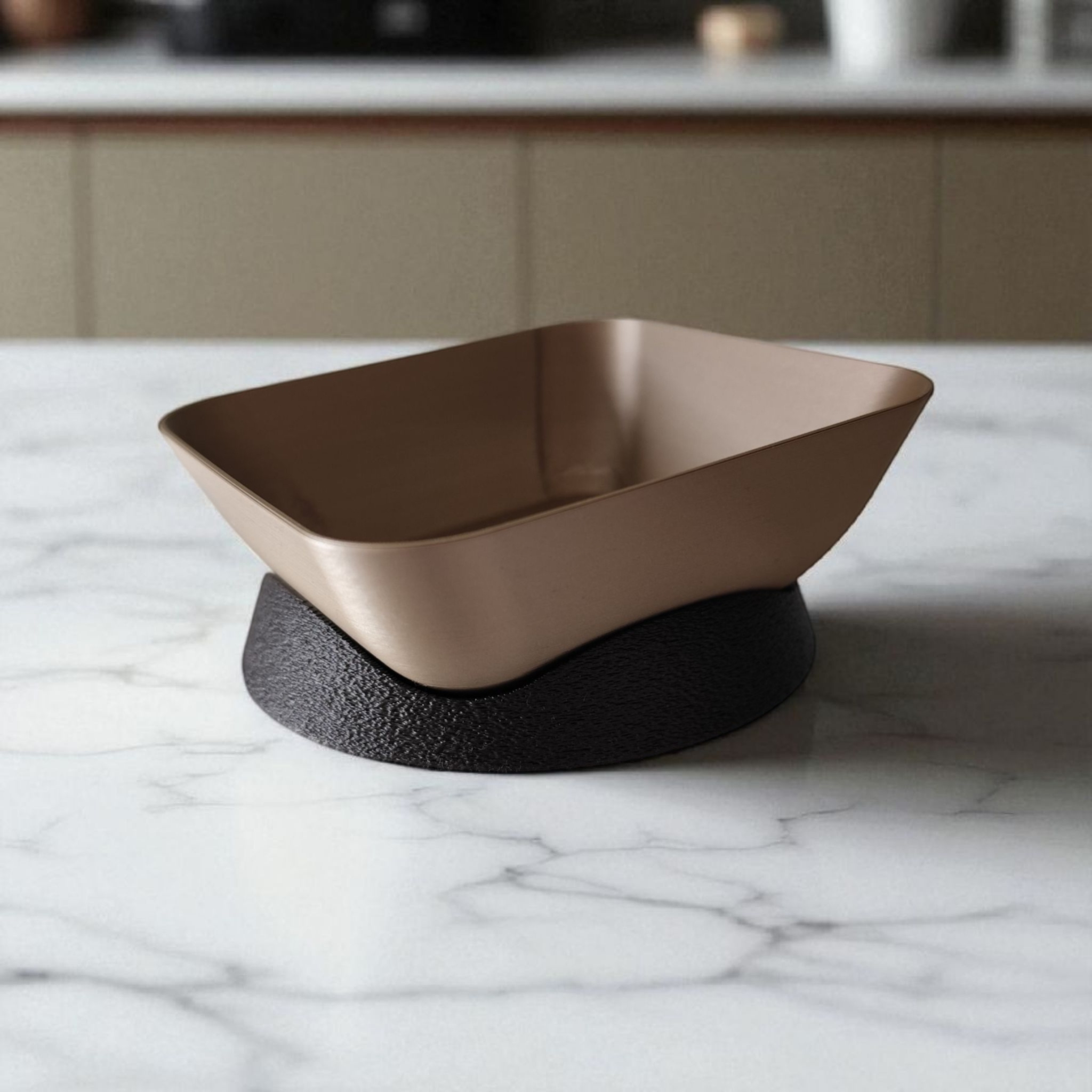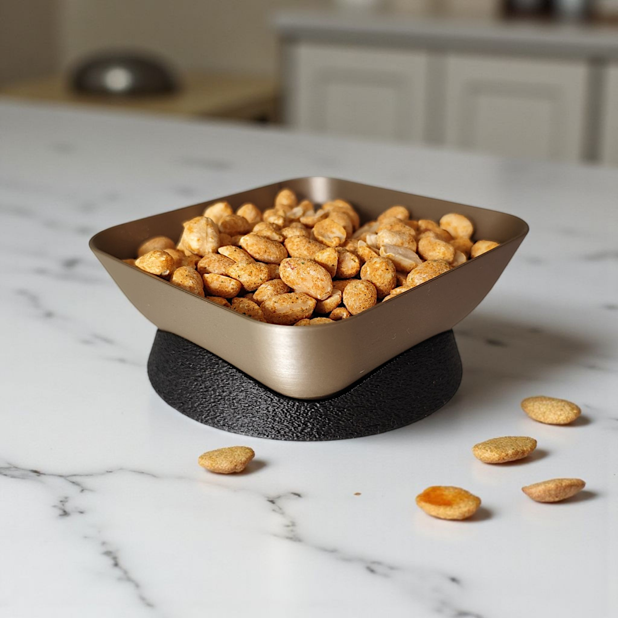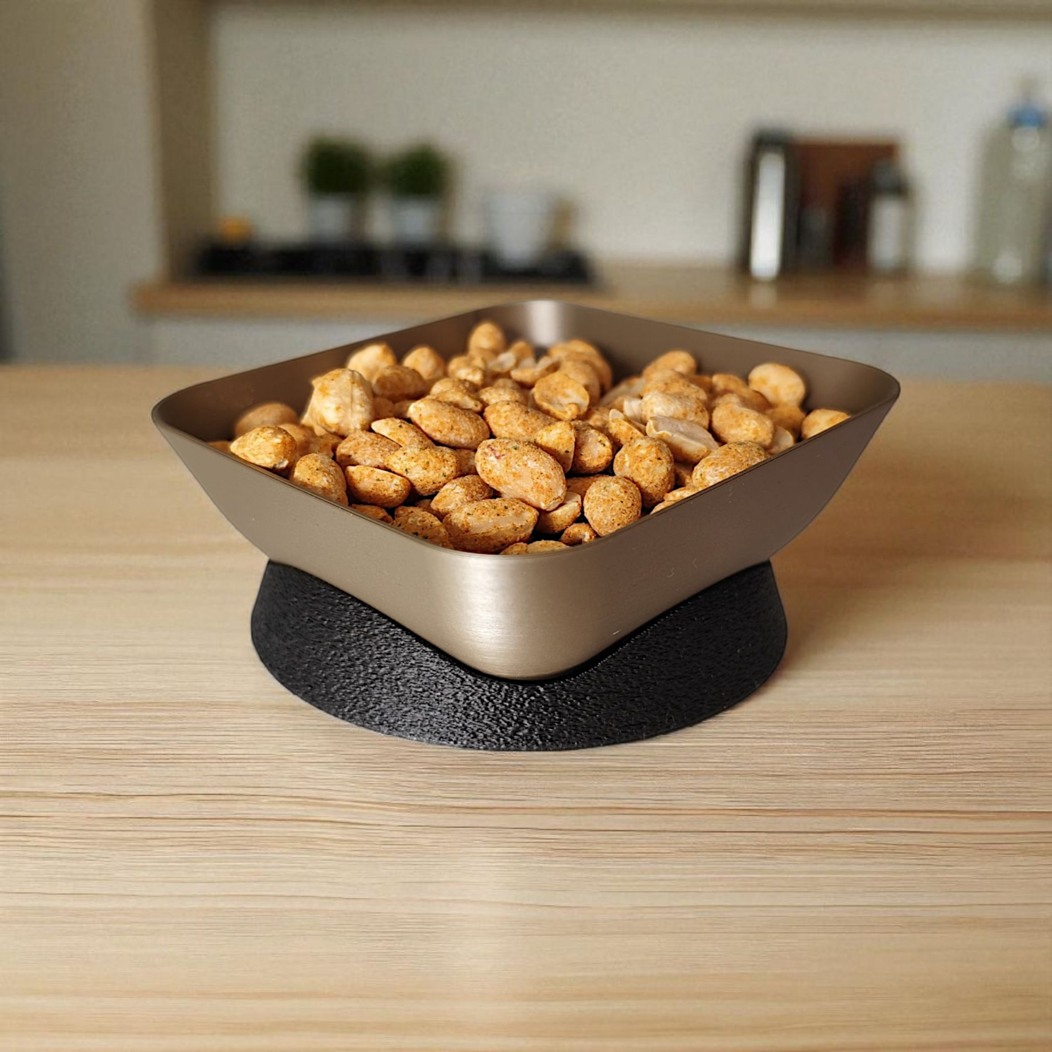 Diese elegante Snackschale besteht aus zwei Teilen: Sockel und Schale, die sich sauber ineinander fügen und eine stabile Einheit bilden. Die Schale ist leicht nach vorne geneigt, damit Snacks beim Fernsehen oder beim Entspannen auf dem Sofa besonders bequem erreichbar sind. Standardmaße: 221 × 221 × 72 mm.