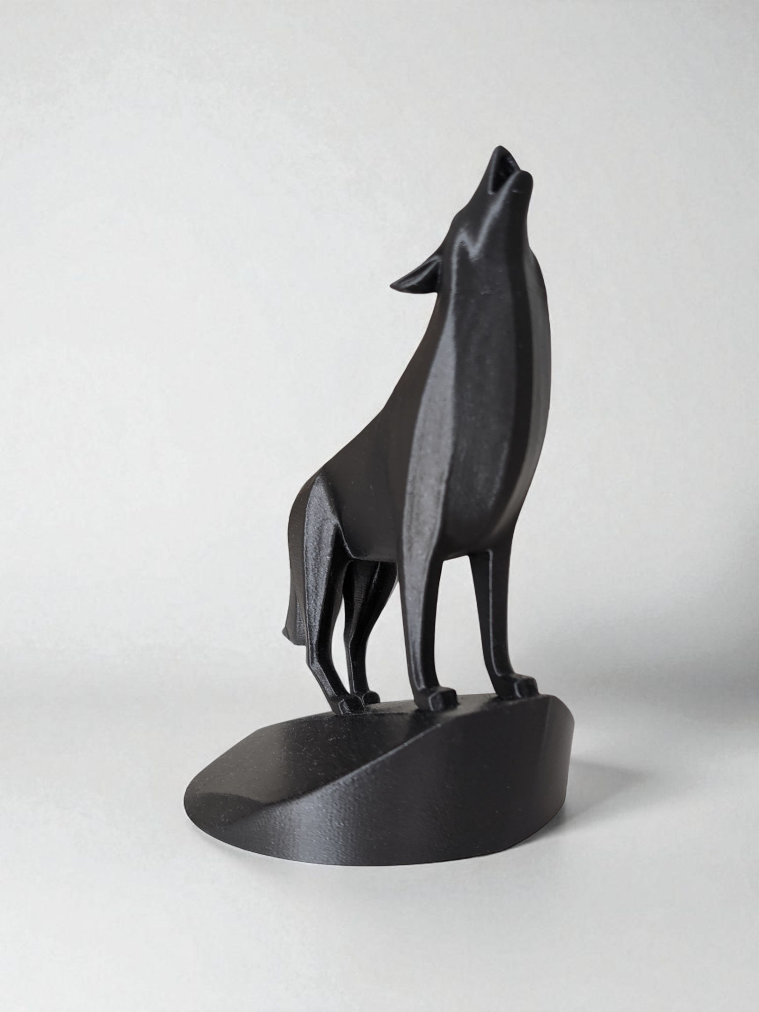 Diese minimalistische Skulptur zeigt einen Wolf in eindrucksvoller, aufrechter Haltung: Kopf erhoben, Schnauze geöffnet — ein Moment konzentrierter Präsenz. Trotz reduzierter Formgebung sind Winkel der Ohren und die Körperspannung bewusst gestaltet, sodass die Figur kraftvoll und zugleich elegant wirkt.