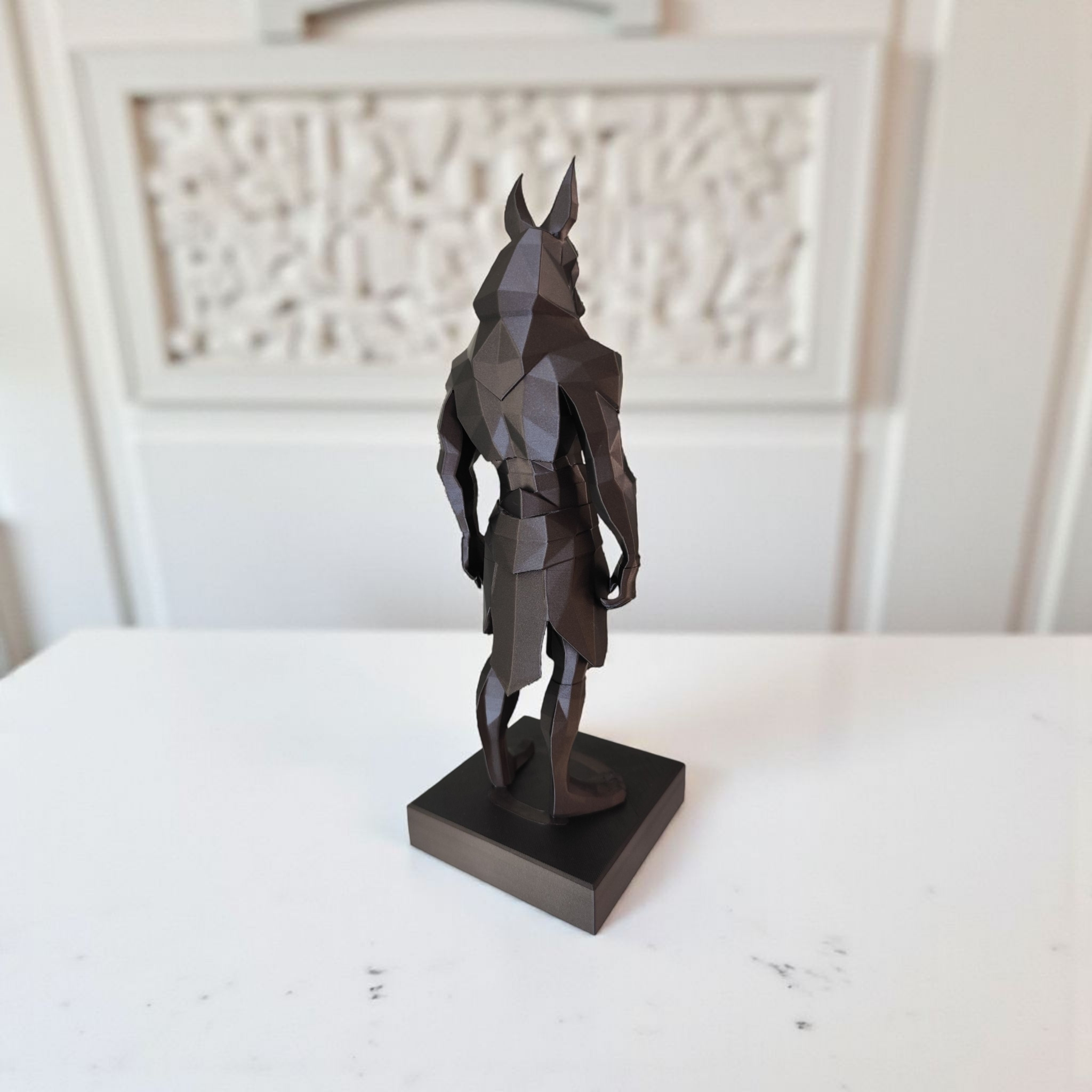 Diese Sculpture #38 ist eine minimalistische Low‑Poly‑Darstellung des ägyptischen Gottes Anubis – prägnant, zeitlos und dekorativ. Die hier angebotene Ausführung wurde im FDM‑3D‑Druck hergestellt und hat die Abmessungen 239 × 84 × 84 mm (Skalierung 80%). Die Farbe ist metallisches Schwarz (Metal Black).