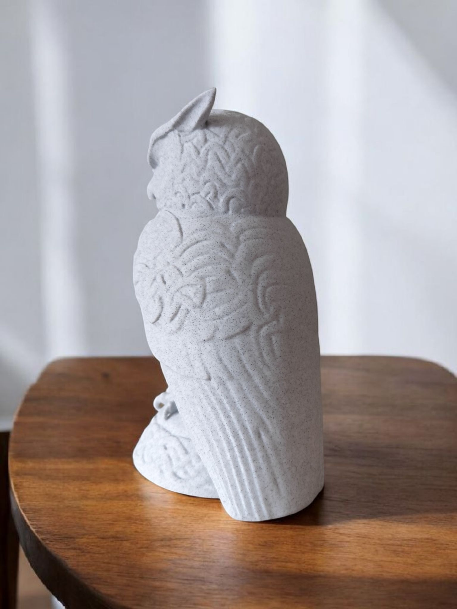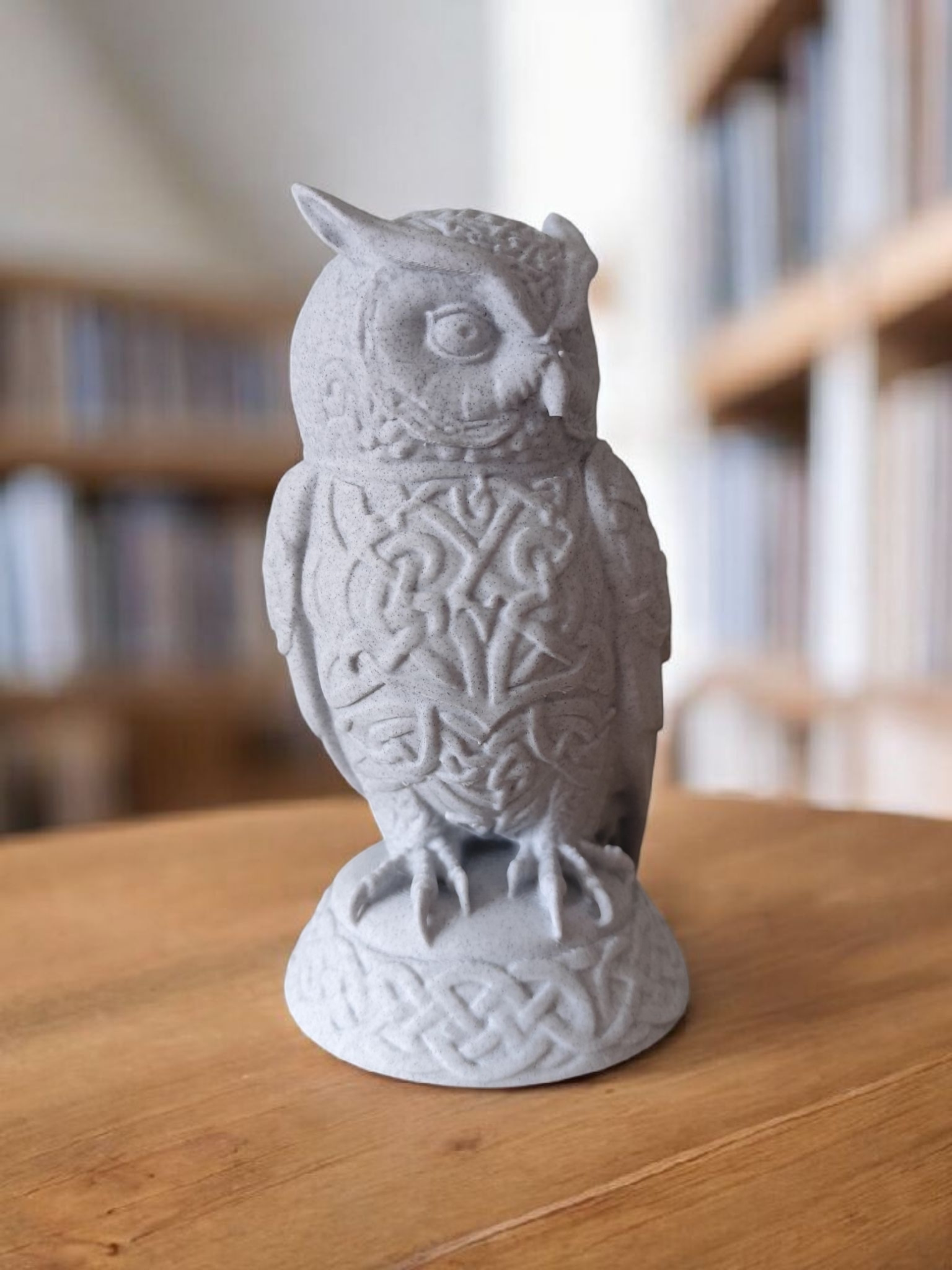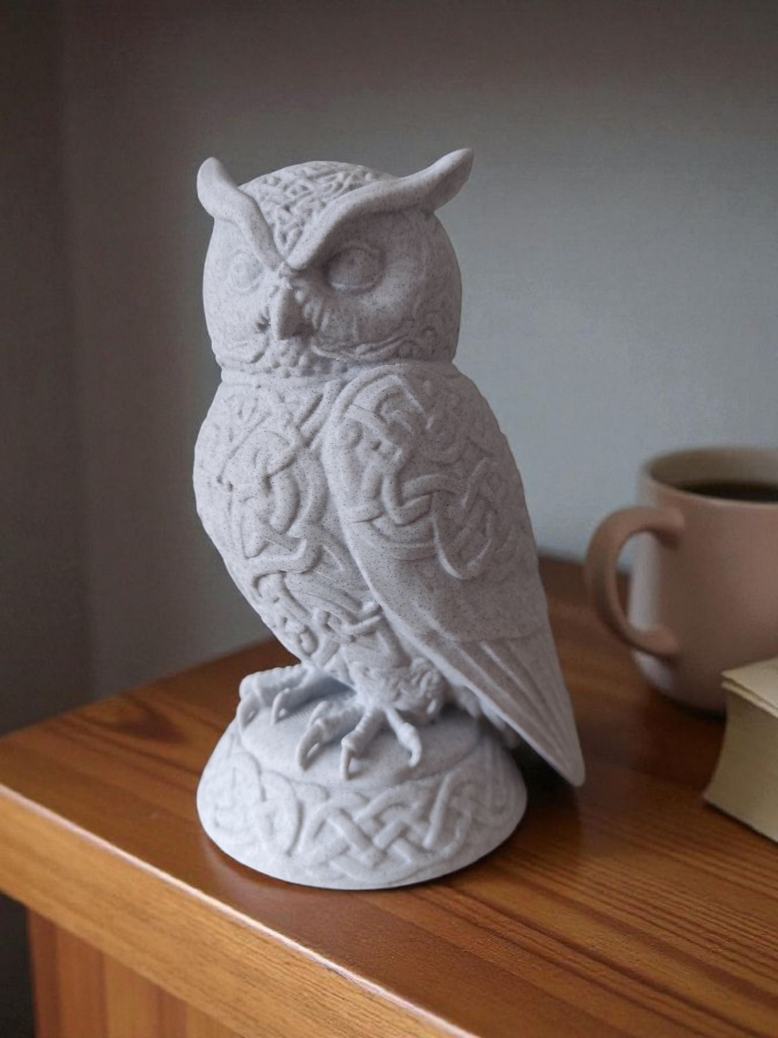 Diese detailreich gestaltete Eulen‑Skulptur zeigt keltisch inspirierte Ornamentik und eignet sich als dekoratives Highlight für Regal, Sideboard oder Büro. Das hier angebotene Exemplar wurde im Maßstab 68 % gefertigt und hat eine ungefähre Größe von 201 × 129 × 116 mm. Gedruckt wurde im FDM 3D‑Druckverfahren aus PLA (Fadenmaterial), Farbe: Marmor‑Grau. PLA ist einfach in der Handhabung, sollte jedoch vor längerer direkter Sonneneinstrahlung und hohen Temperaturen geschützt werden. Bitte beachten Sie: Durch das FDM‑Verfahren können leichte Oberflächenunregelmäßigkeiten oder kleine Druckspuren entstehen; dies ist technisch bedingt und kein Reklamationsgrund. Farbe und Optik entsprechen den Produktbildern. Zur Reinigung empfehlen wir ein weiches, trockenes oder leicht feuchtes Tuch; aggressive Lösungsmittel vermeiden.