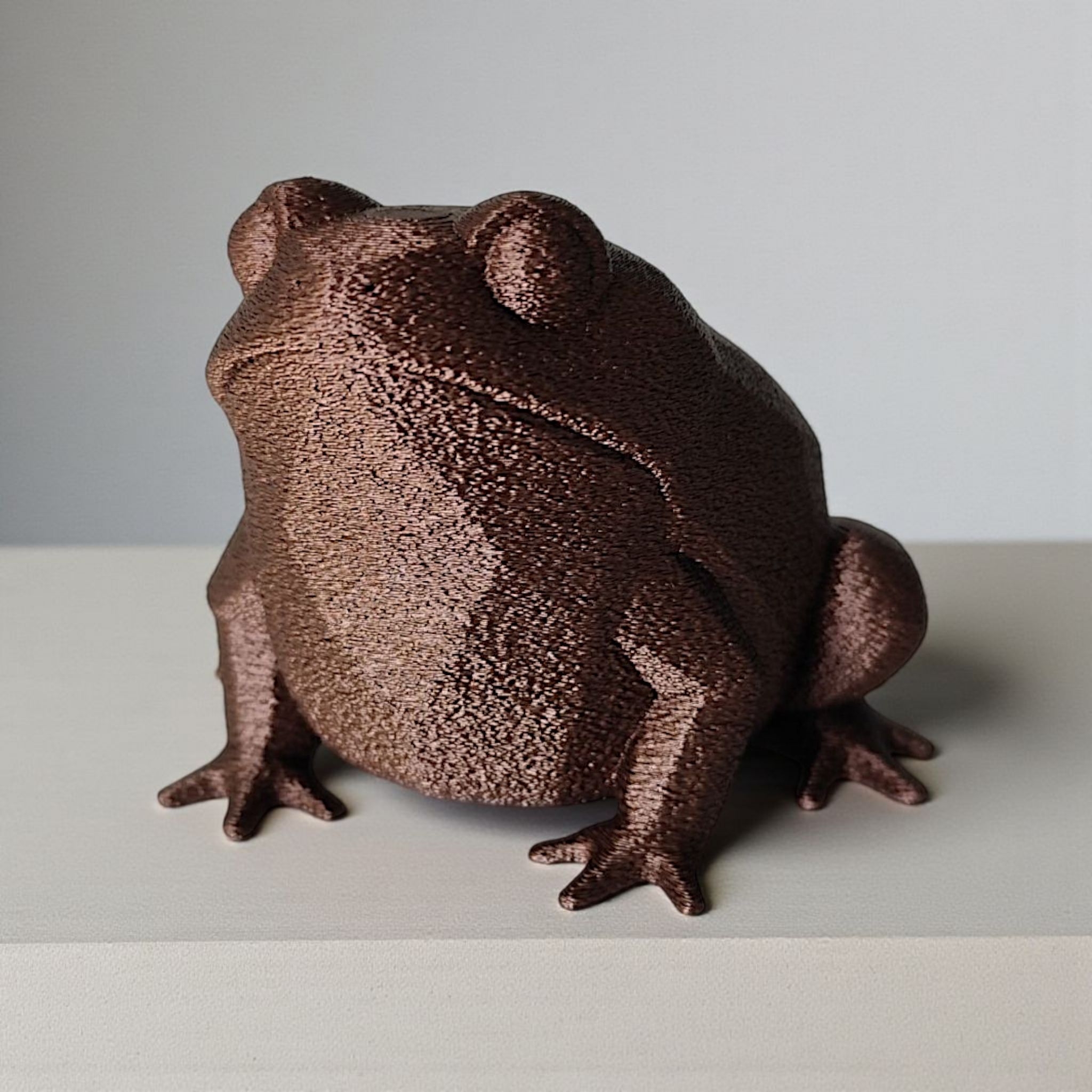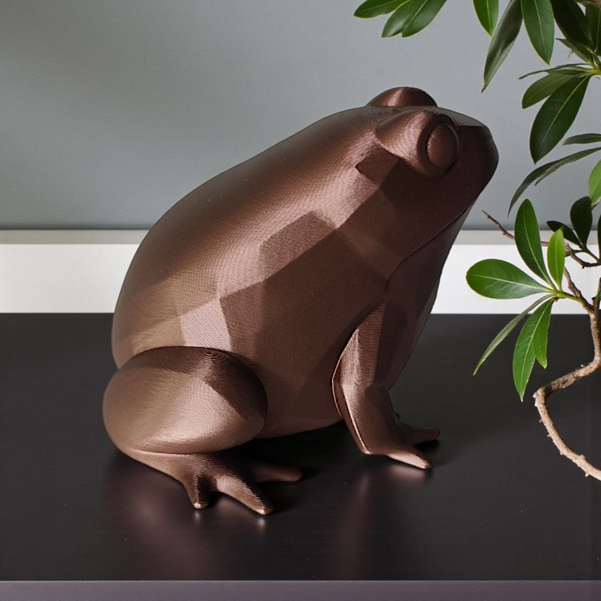 Stilvolle Low-Poly-Frosch-Skulptur, 3D gedruckt (FDM). Dieses dekorative Objekt steht für minimalistisches Design und überzeugt durch klare, kantige Formen im Low-Poly-Stil. Die ursprünglich größeren Modellmaße wurden so angepasst, dass die maximale Druckgröße 250 × 250 × 250 mm nicht überschreitet; die hier angegebene Standardgröße lautet 250 × 223 × 185 mm (skaliert aus dem Original 300 × 267 × 222 mm). Als Referenz sind zusätzlich zwei gebräuchliche Druckgrößen: 120 × 107 × 89 mm (40 %) und 90 × 80 × 66 mm (30 %).