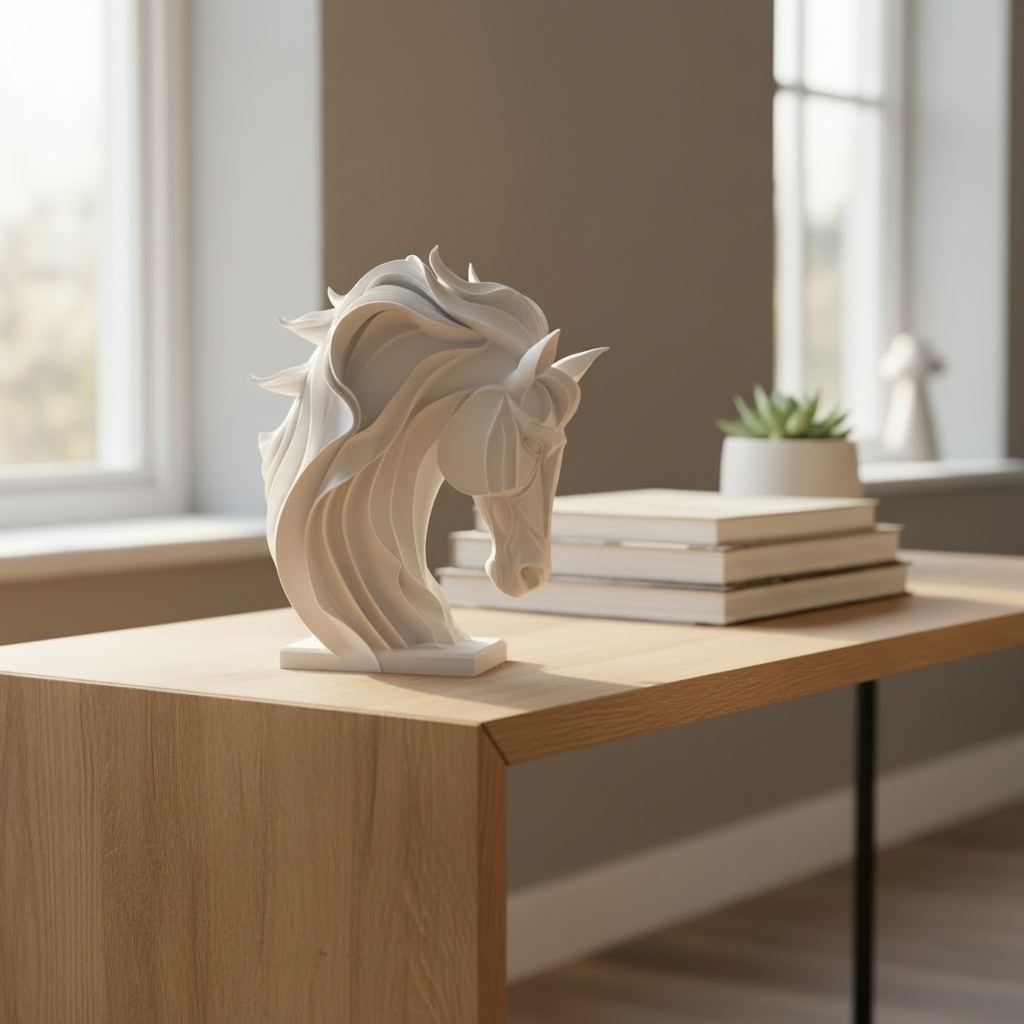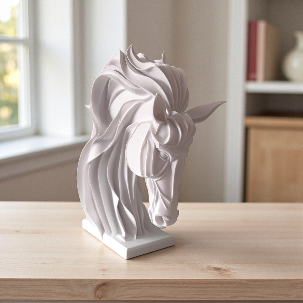Diese abstrakte Pferdeskulptur verbindet klare Linien mit einer dynamischen, fließenden Mähne und wirkt sowohl elegant als auch kraftvoll. Das präsentierte Exemplar wurde im Maßstab 50 % gefertigt und hat die Maße 149 × 143 × 58 mm, ideal für Regal, Sideboard oder Schreibtisch.