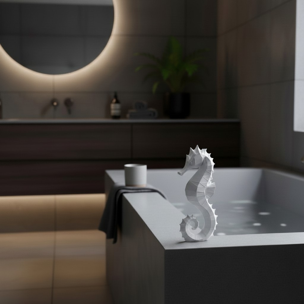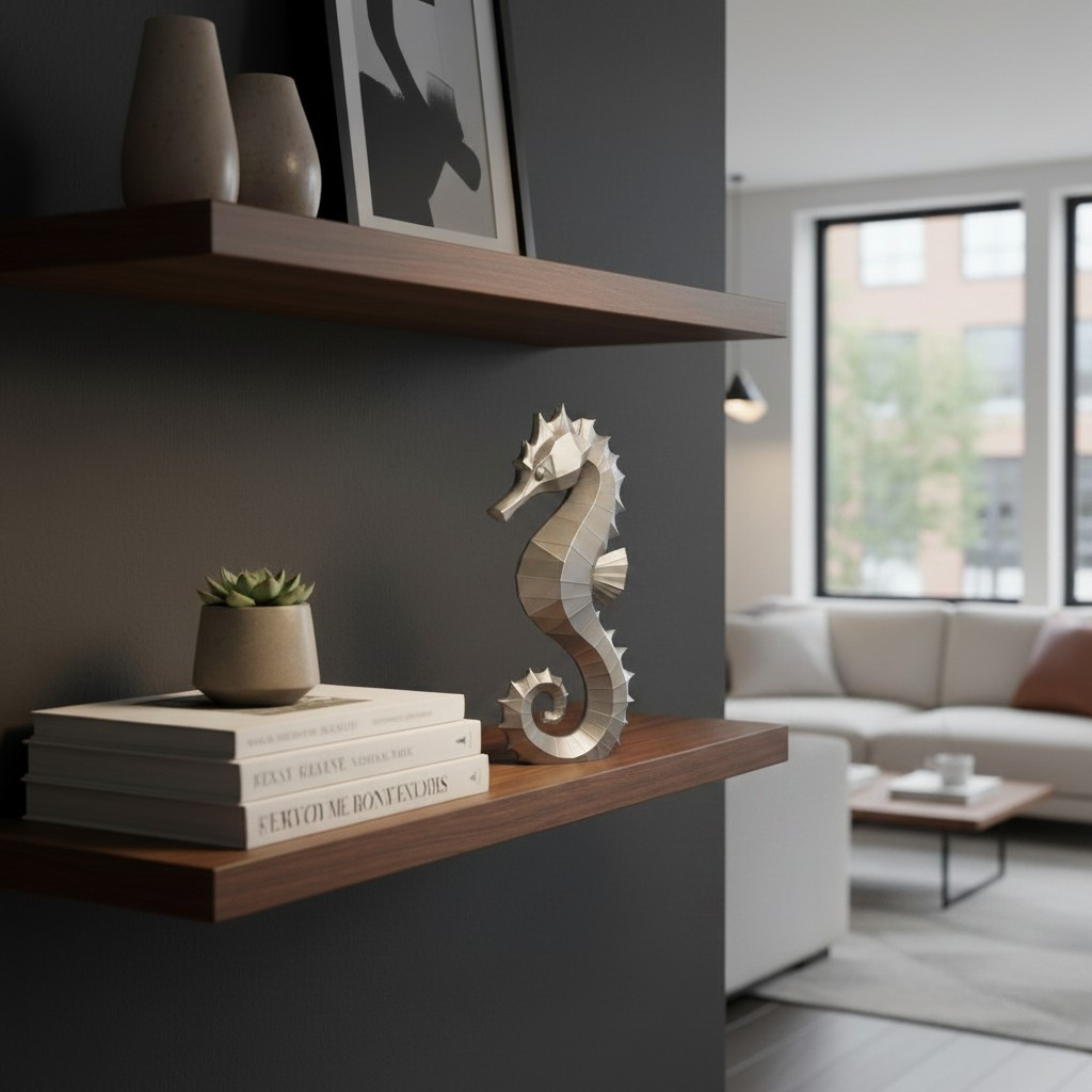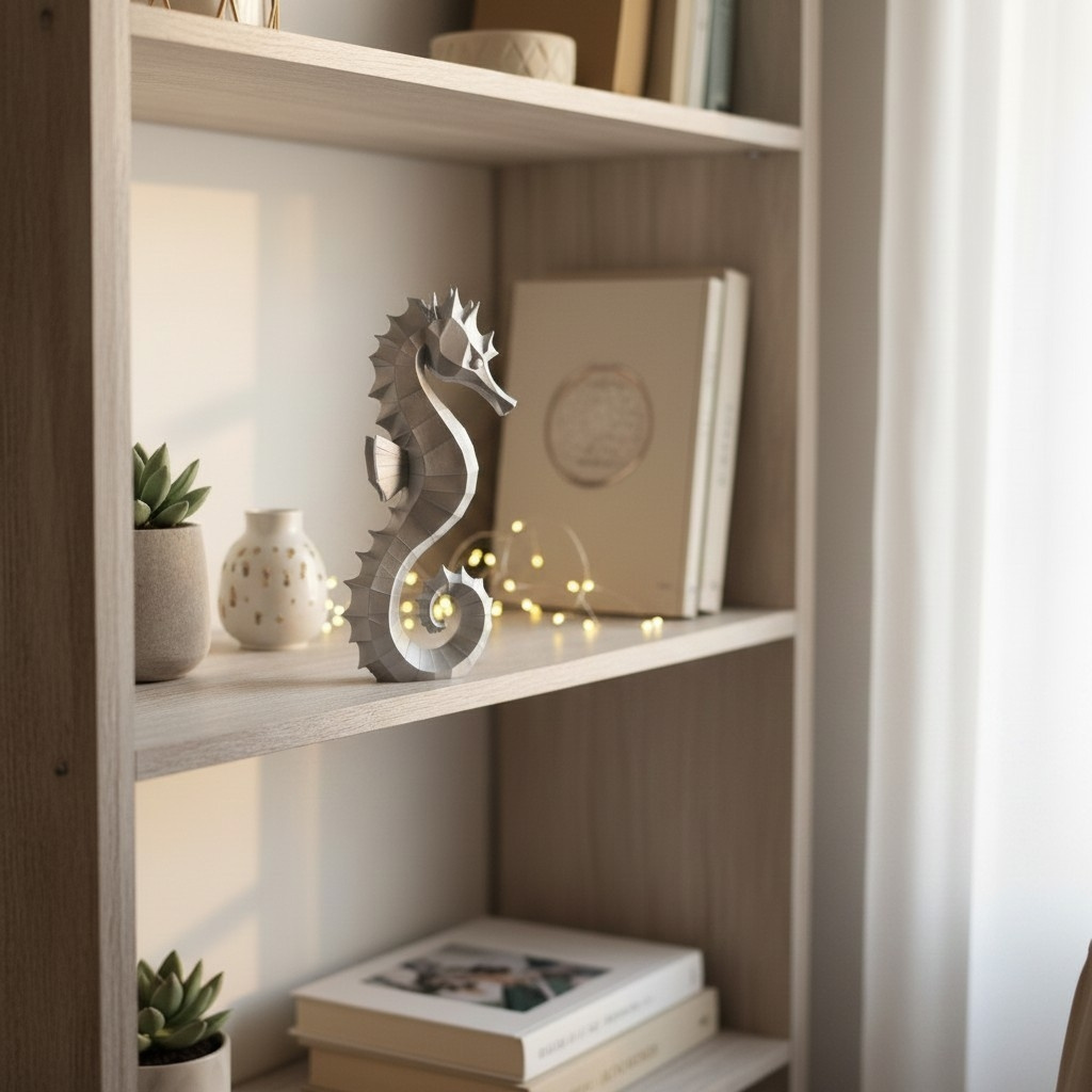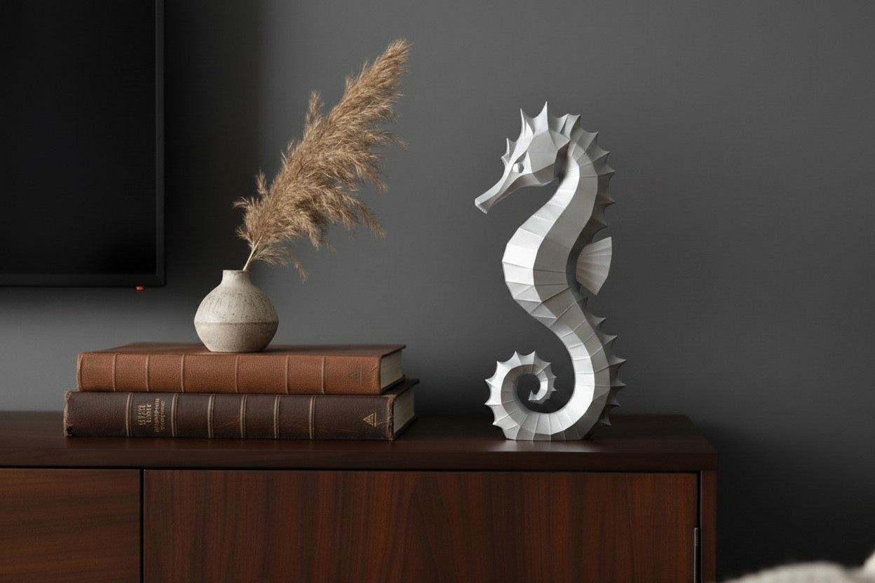 Diese Skulptur #54 zeigt eine moderne Interpretation eines Seepferdchens und ist als dekoratives Objekt für Zuhause oder Büro gestaltet. Die Standardmaße betragen 250 × 124 × 48 mm. Die Ausführung erfolgt im FDM-3D-Druckverfahren aus PLA in Silber (Farbton wie auf den Produktbildern).