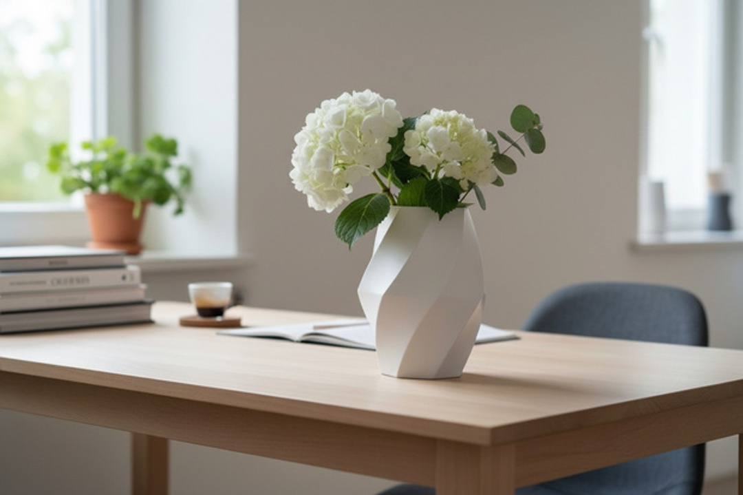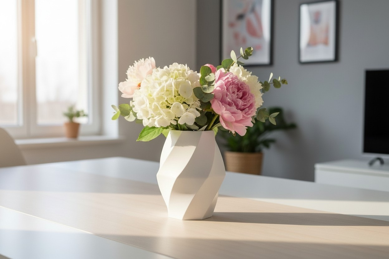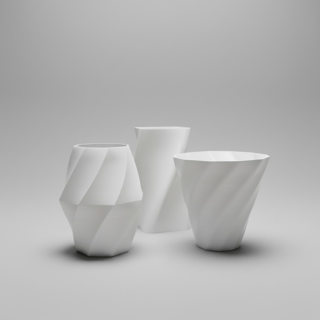 Diese Swirled Vase – Modell 3 von 3 – verbindet eine dezente Drehung mit einem klaren, modernen und zeitlosen Design. Die Vase wurde im FDM-3D-Druck gefertigt und ist dadurch ein markantes, jedoch sachlich-elegantes Dekoelement für Wohn- und Arbeitsbereiche.