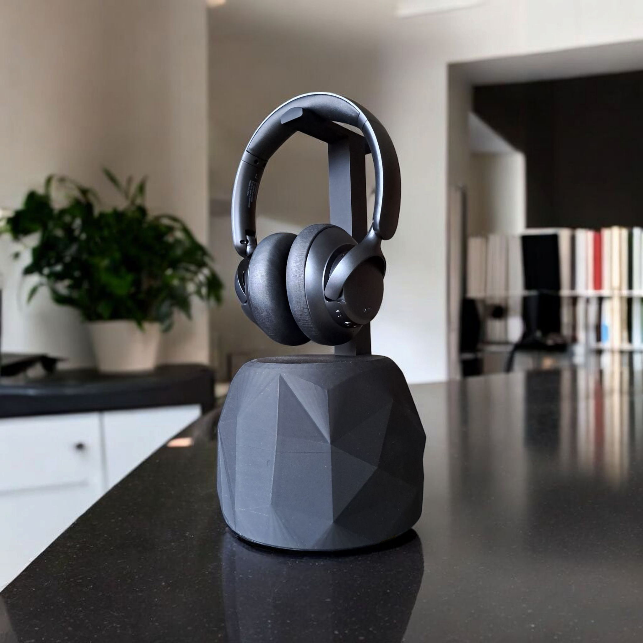 TheRock ist ein minimalistischer Kopfhörerständer im Low‑Poly‑Look, entworfen für Nutzer, die Funktionalität und klares Design schätzen. Die facettierten Kanten verleihen ihm einen skulpturalen, modernen Charakter, der in jedes Arbeits- oder Gaming‑Setup passt.