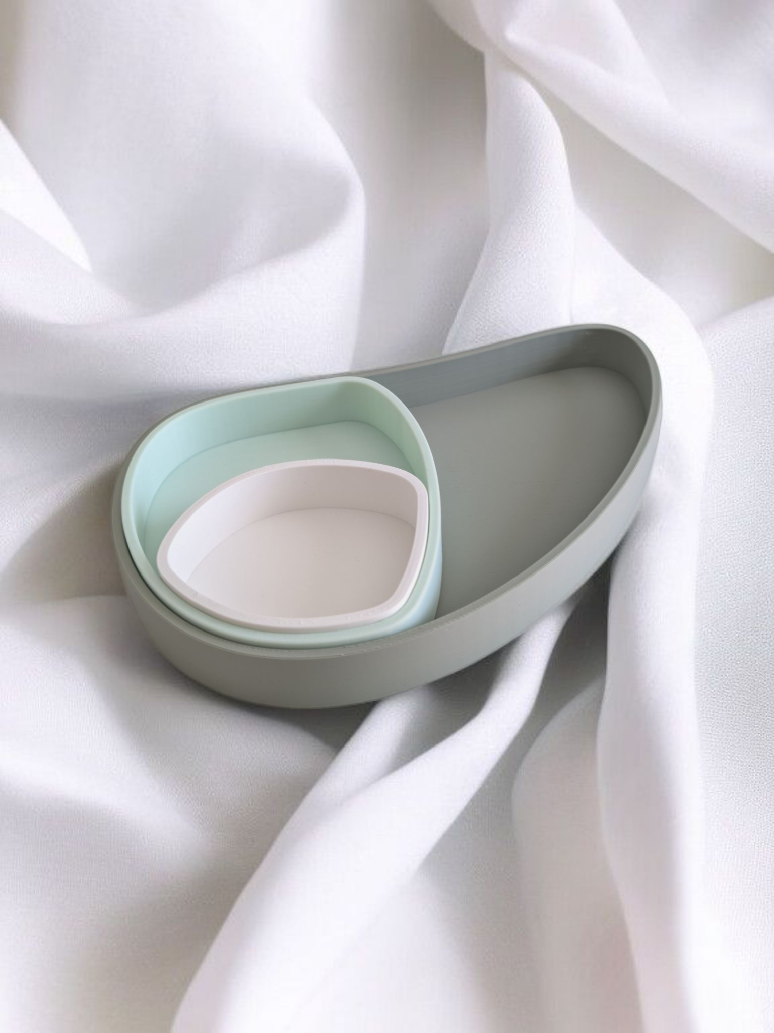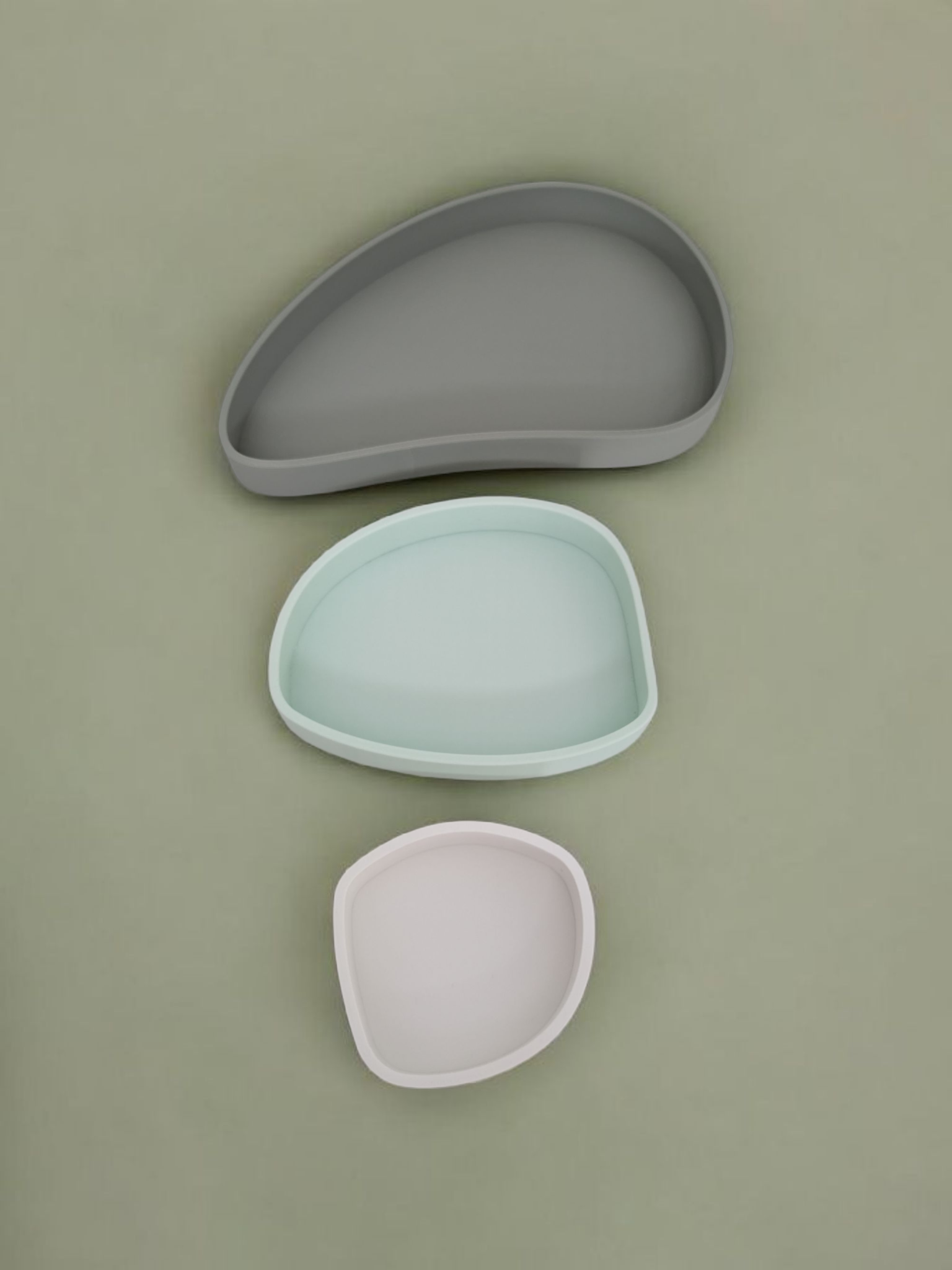 Das TrioCurve Nesting-Tray-Set besteht aus drei unterschiedlich großen, modularen Ablageschalen mit weichen, organischen Konturen, die sich platzsparend ineinander schachteln lassen. Sie können die Schalen einzeln nutzen oder gestapelt aufbewahren – ideal für Schmuck, Münzen, Büroklammern, kleine Pflanzengefäße oder Snacks.