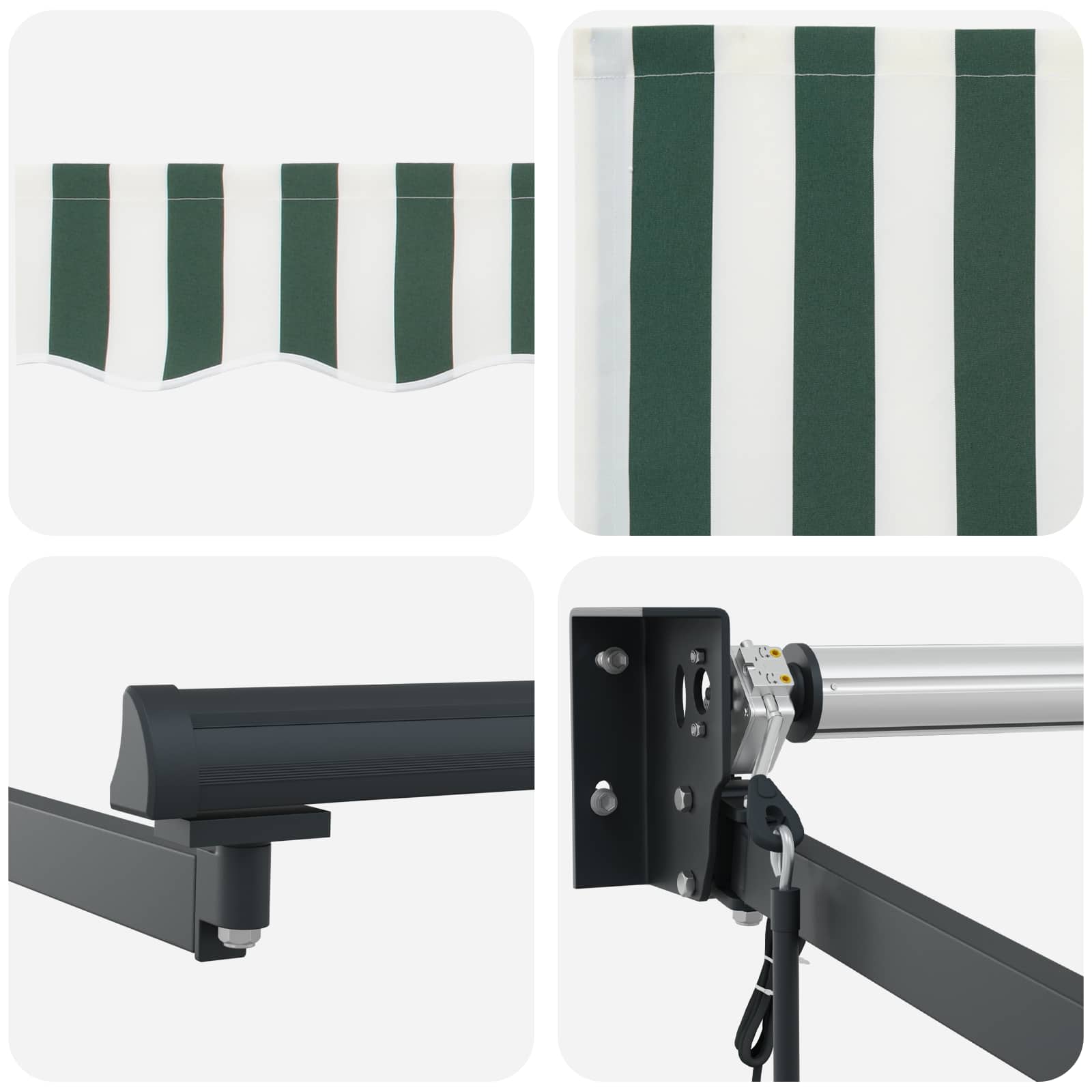 Dieser stylische einziehbare Sonnenschutz ist die perfekte Lösung für deinen Garten oder deine Terrasse – er vereint schlichtes Design und praktische Funktionalität. Mit seinen klaren Linien und dem modernen Look sorgt er für frischen Wind in deinem Außenbereich. Profitiere von einem großzügigen Schattenplatz von 500 x 300 cm, egal ob du mit der Familie feierst oder einfach entspannen möchtest. Der Sonnenschutz behält seine schönen grün-weißen Farben, sodass du erfrischenden Schatten und UV-Schutz genießen kannst. Materialien: Der Sonnenschutz besteht aus 100 % Polyester und stabilem Aluminium. Der Polyesterstoff schützt super gegen Verblassen und UV-Strahlen und sieht dabei top aus. Der Aluminiumrahmen sorgt für festen Halt und ist bereit für wechselnde Wetterlagen. Enthaltene Komponenten: Das Paket kommt mit einem stabilen Rahmen, dem Stoff und einer praktischen Fernbedienung – die Montage geht schnell und einfach vonstatten. Der Rahmen hält alles sicher, während du den Schatten bequem per Fernbedienung einstellen kannst. Merkmale / Funktion / Design: Der einziehbare Mechanismus ermöglicht dir, den Sonnenschutz nach Bedarf aus- oder einzuziehen. Die Fernbedienung sorgt für zusätzlichen Komfort, sodass du während deines Aufenthalts im Freien alles leicht anpassen kannst – perfekt bei sonnigen Wechsteln. Empfohlene Anwendungen: Ideal für den Außenbereich, bringt er Schatten in Gärten und auf Terrassen. Das moderne Design passt perfekt in jeden Außenbereich und ist für privat und gewerblich nutzbar. Pflege & Wartung: Kümmere dich problemlos um die Pflege, indem du lästige Flecken einfach mit einem sauberen, trockenen Tuch abwischst. Lagere den Sonnenschutz bei extremem Wetter, um sein gutes Aussehen und Funktion zu erhalten, damit du langfristig Freude daran hast.