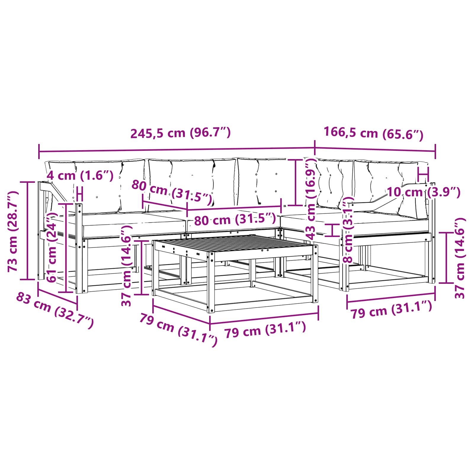 - 4 x Mittelsitz: 79 x 83 x 73 cm (LxBxH)