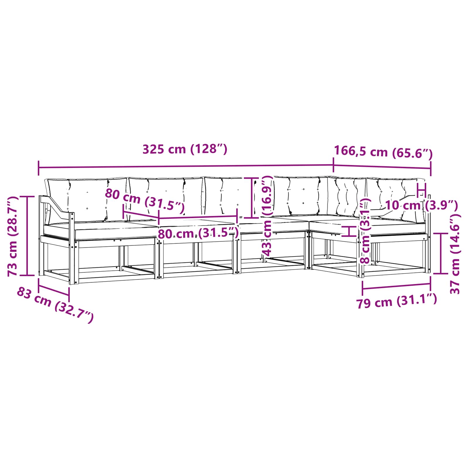 - Gesamtabmessungen: 325 x 166,5 x 73 cm (L x B x H)