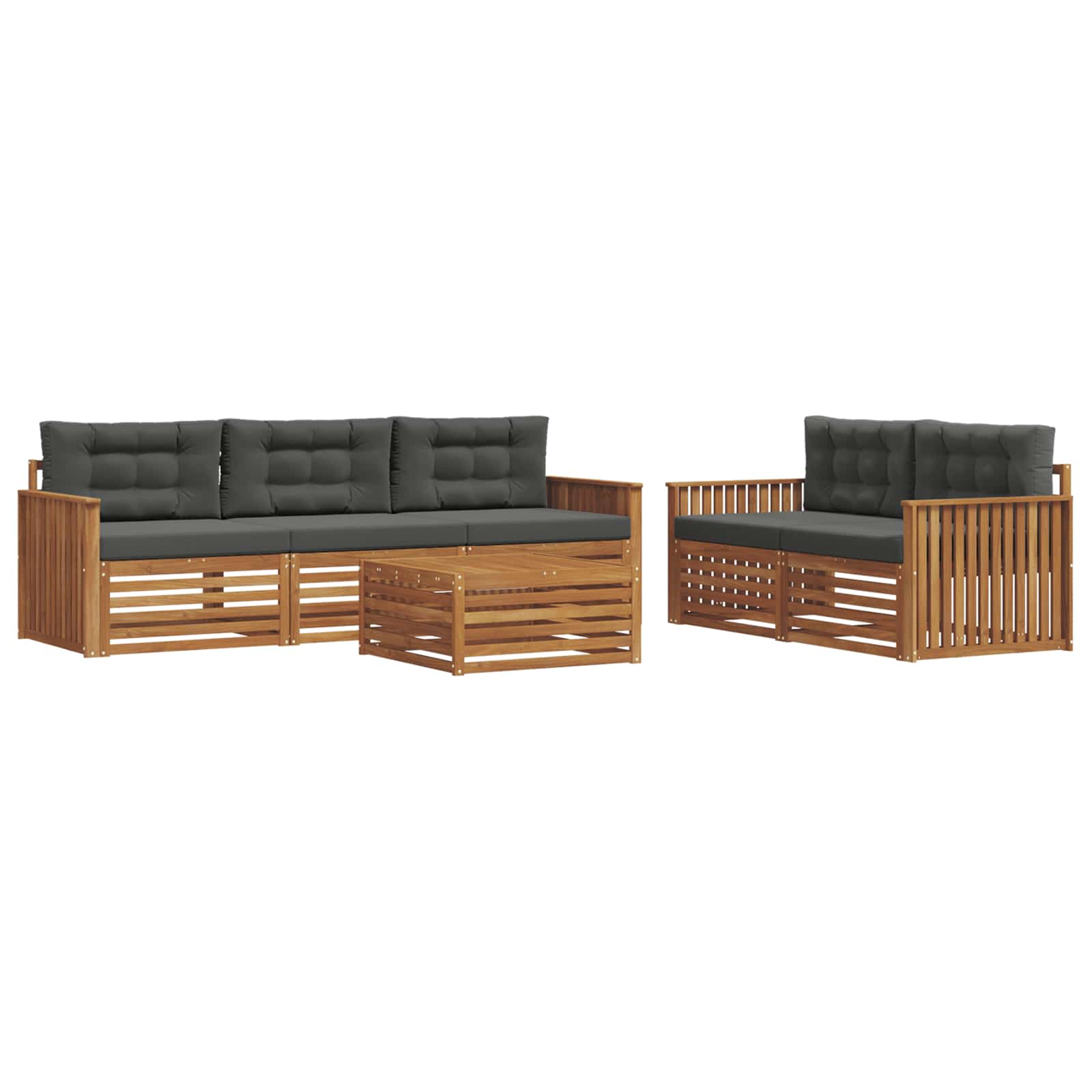 Das Gartenmöbel-Set verbindet coolen Style mit praktischer Funktionalität und wird zum echten Hingucker in jedem Garten oder auf jeder Terrasse. Das moderne Design mit klaren Linien und wenigen Details strahlt Eleganz aus und lädt zum Entspannen im Freien oder zu geselligen Runden ein. Hergestellt aus massivem Akazienholz, sorgt das Set für Langlebigkeit und sieht dabei auch noch gut aus – die perfekte Wahl für alle, die praktische und stylische Gartenmöbel wollen. Massives Akazienholz: Dieses Gartenmöbel-Set ist aus solidem Akazienholz gemacht und bekannt für seine Robustheit und Wetterbeständigkeit. Die stabile Bauweise gibt dir verlässliche Unterstützung und langanhaltende Stabilität, während der warme, natürliche Farbton jeden Garten oder jede Terrasse verschönert. Wetterfestes Design: Mit einer lackierten Oberfläche bietet dieses Möbelset extra Schutz gegen Sonne, leichten Regen und andere Witterungen. Die polierte Behandlung sorgt dafür, dass das Set toll aussieht und lange hält, egal ob im Garten, auf der Terrasse oder im Hinterhof. Design & Komponenten: Jedes Stück, von den Armlehnen bis zu den Rückenlehnen, wurde für Style und Funktionalität konzipiert. Praktische Features sorgen für zusätzlichen Komfort und das Design sieht einfach toll aus für verschiedene Außenanlässe. Komfort & Flexibilität: Das modulare Design erlaubt dir, die Anordnung flexibel zu ändern, damit es zu deinen Bedürfnissen passt. Perfekt zum Entspannen, für gesellige Treffen oder ruhige Lesestunden – das Set passt sich deinem Außenbereich an und bietet maximalen Komfort. Einfache Pflege: Halte die Möbel in gutem Zustand, indem du die Oberflächen mit einem feuchten Tuch abwischst und scharfe Reiniger vermeidest. Einfache Pflege trägt dazu bei, das Aussehen zu bewahren und die Lebensdauer deiner Möbel zu verlängern.