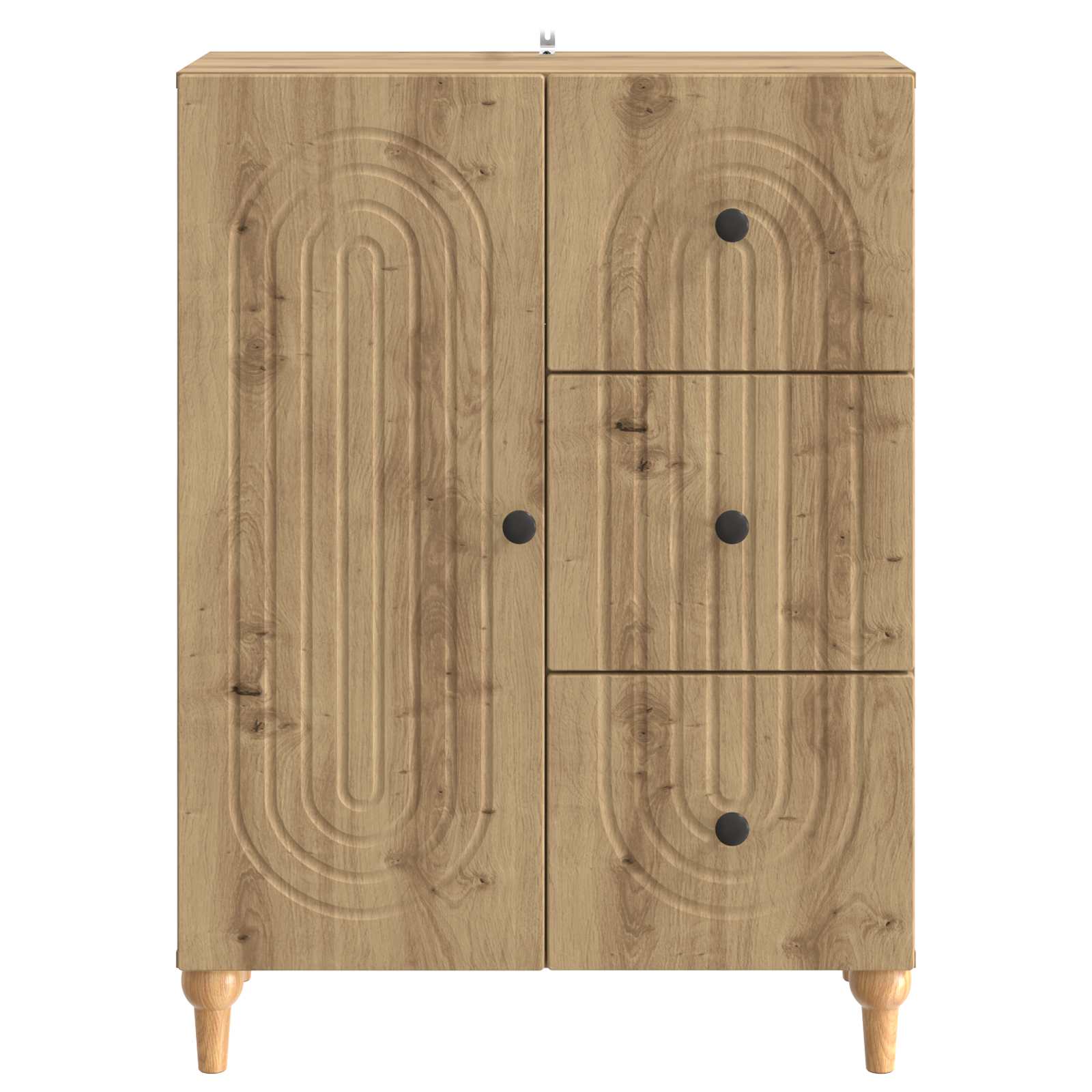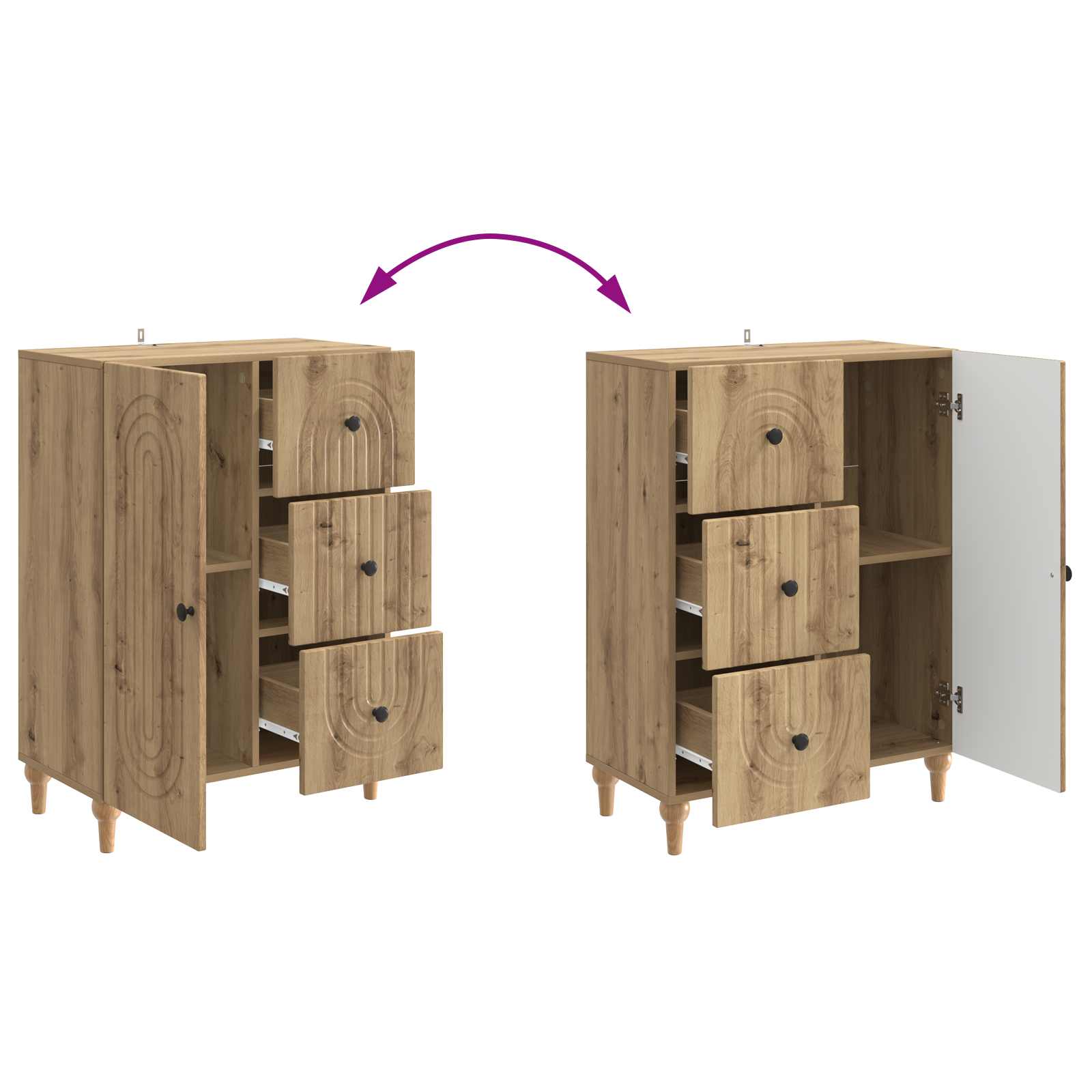 Dieses moderne Sideboard sieht nicht nur gut aus, sondern ist auch mega praktisch! Ideal für dein Wohnzimmer oder Esszimmer. Mit seinem schlichten, rechteckigen Design bietet es viel Stauraum und bleibt dabei minimalistisch. Der feine Streifenrand macht es noch schicker und passt in jede Einrichtung. Dieses Stück verbindet also Style mit echter Nutzen und ist ein echtes Must-Have für deine Möbelkollektion! Holzwerkstoff-Konstruktion Dieses Sideboard besteht aus Holzwerkstoff, der dauerhaft und robust ist. Die glatte Oberfläche und die starke Bauweise sorgen dafür, dass es dir lange treu bleibt. Außerdem verzieht sich das Material nicht, was bedeutet, dass es für deine Aufbewahrungsbedürfnisse immer eine sichere Wahl ist. Praktische Regale Die praktischen Regale sind perfekt, um alles ordentlich zu lagern und zu sortieren. Hier hast du genug Platz für Bücher, Geschirr oder Sachen, die du oft brauchst. Alles bleibt aufgeräumt und leicht erreichbar. Zugängliche Pendeltüren Mit den 90° Pendeltüren kommst du super easy an deine Sachen. Sie öffnen sich weit, sodass du alles im Regal schnell findest und problemlos nutzen kannst. Funktionale Vielseitigkeit Dieses Sideboard ist für viele Einsatzmöglichkeiten gedacht: als schicker Stauraum im Esszimmer, als zusätzliches Möbelstück im Wohnzimmer oder sogar als stylische Ablage im Flur. Es passt einfach überall und macht sich in verschiedenen Umgebungen nützlich. Einfache Pflege Um es sauber zu halten, reicht ein Wischen mit einem feuchten Tuch. Diese einfache Routine sorgt dafür, dass dein Sideboard über Jahre hinweg toll aussieht und funktional bleibt.