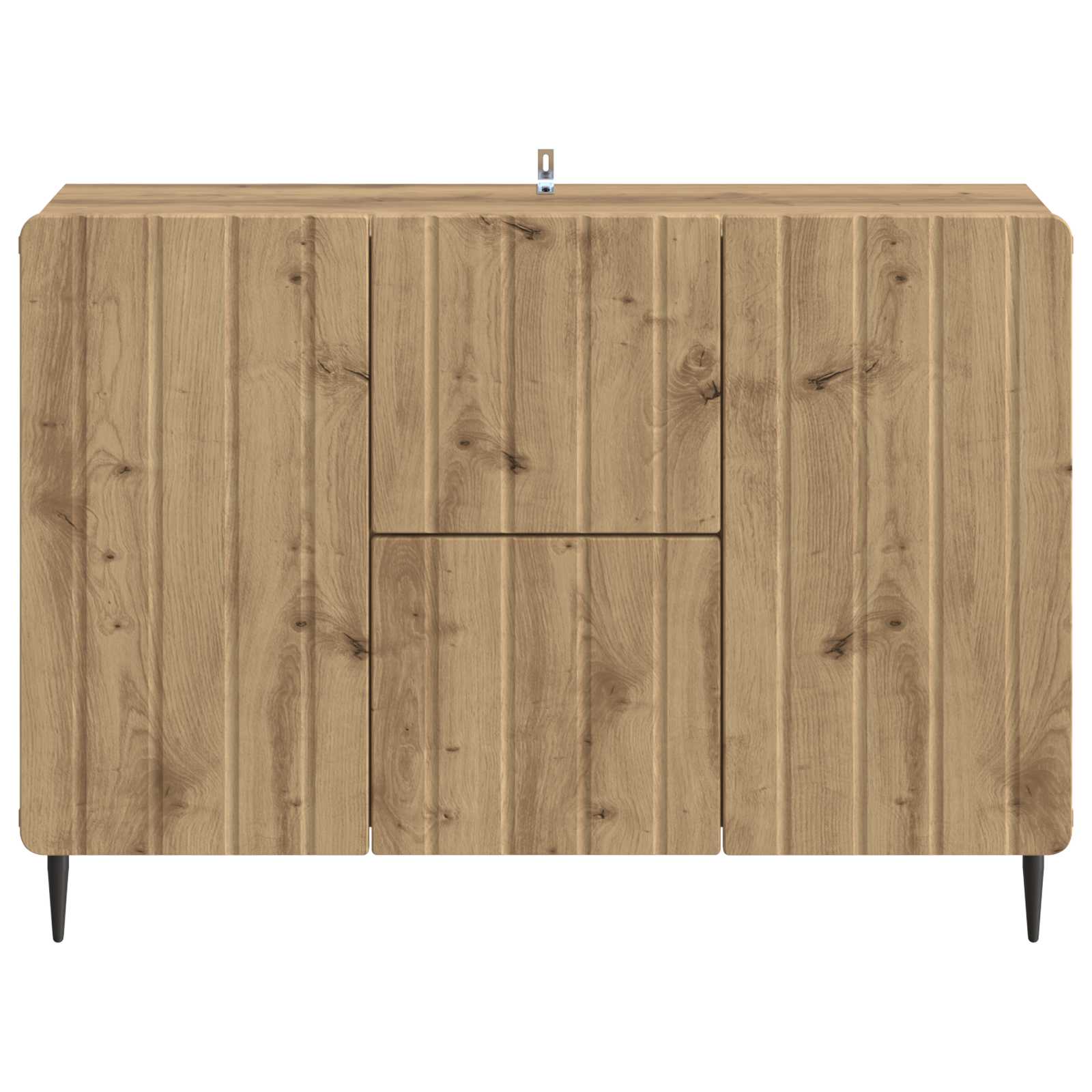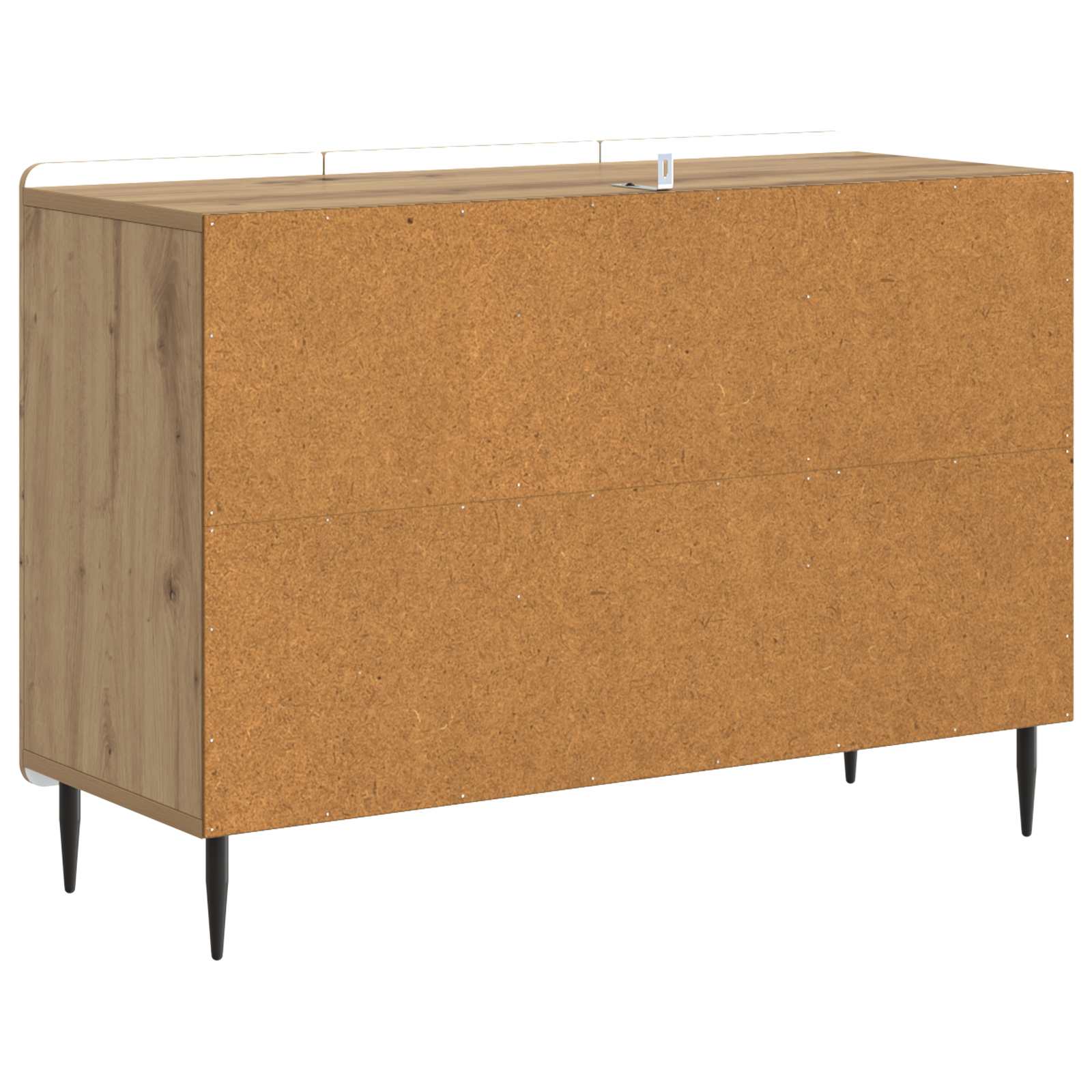 Das moderne Sideboard ist ein schickes und praktisches Möbelstück, das sich wunderbar in Wohn- oder Essbereiche einfügt und eine stylische Lösung für deine Stauraumbedürfnisse bietet. Mit seiner schlanken rechteckigen Form bringt es einen zeitgemäßen Vibe rein, wo Einfachheit und Funktionalität zusammenkommen. Mit 89 x 34.5 x 62 cm hat dieses Sideboard viel Stauraum mit Fächern für Geschirr, Tischwäsche oder andere Essentials, alles schön in klaren Linien, die die moderne Wohnästhetik ergänzen. Holzwerkstoff-Konstruktion Dieses Sideboard ist aus Holzwerkstoff und hat eine stabile, zuverlässige Struktur, die lange hält. Der Werkstoff verformt sich nicht leicht und ist super geeignet für ein robustes Möbelstück, das auch nach Jahren noch gut aussieht. Seine glatte Oberfläche sorgt für einen Hauch von Stil, der das Gesamtbild des Sideboards aufpeppt. Schwarze Stahlbeine Mit schwarzen Stahlbeinen hat dieses Sideboard eine tolle Grundlage, die Stabilität und Gleichgewicht sichert. Die Beine halten das Gewicht problemlos aus und verleihen einen modernen, industriellen Look, der Stil und Funktionalität vereint. Stahl ist langlebig und macht die Beine zur besten Wahl für langfristige Nutzung. 90°-Pendeltür mit Scharnier Das Sideboard hat 90°-Pendeltüren, die den Zugang zu den Fächern erleichtern. So kannst du ganz easy an Sachen ran, ohne dass was im Weg ist. Der reibungslose Betrieb sorgt für angenehme Nutzung und behält ein schlankes Aussehen. Reibungslose Roll-Out-Schubladen Die Roll-Out-Schubladen gleiten mühelos, ideal zur Organisation von verschiedenen Dingen, von Tischwäsche bis Besteck. So hat alles seinen Platz und der leise Betrieb macht alles einfacher und sorgt für ein einladendes, ordentliches Ambiente. Pflegehinweise Die Pflege ist super einfach. Wisch die Oberflächen mit einem feuchten Tuch ab, damit es immer gut aussieht und die Materialien lange halten. Regelmäßiges Putzen erhält den frischen Look, sodass es über die Jahre hinweg ein beliebtes Möbelstück bleibt.