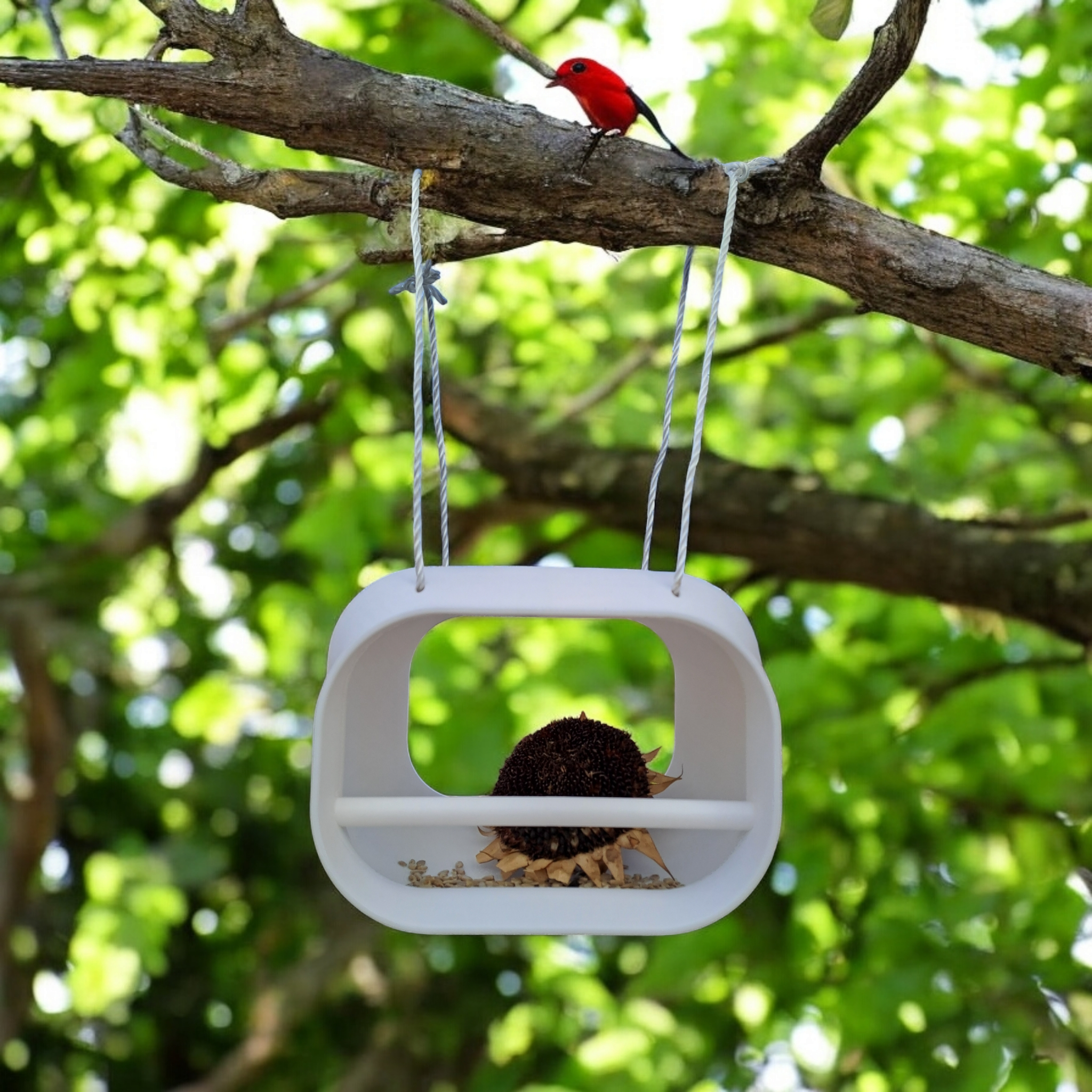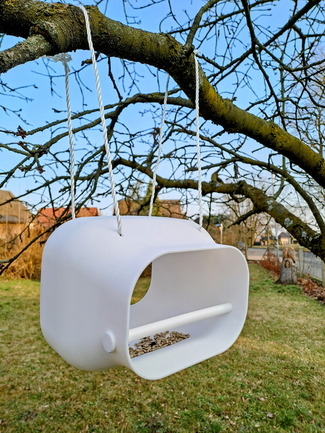 Praktische Winter-Futterstation für Vögel, 3D gedruckt und für den Außenbereich konzipiert. Das durchdachte Design besteht aus einem robusten Gehäuse mit einem zweiteiligen Sitz, der durch seitliche Öffnungen zusammengesteckt und einrastet. Das Dach verfügt über vier Bohrungen zur sicheren Befestigung an einem Ast, einer Überdachung oder einer Befestigungskonstruktion.