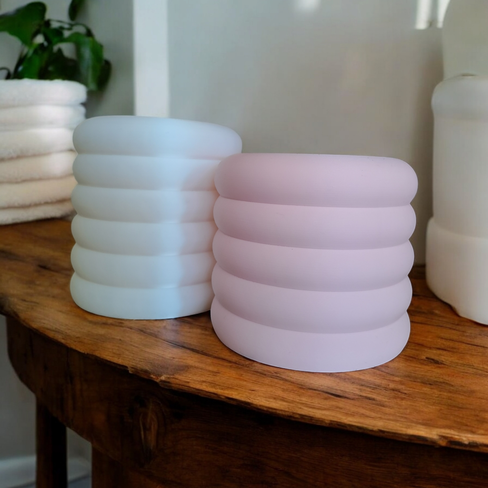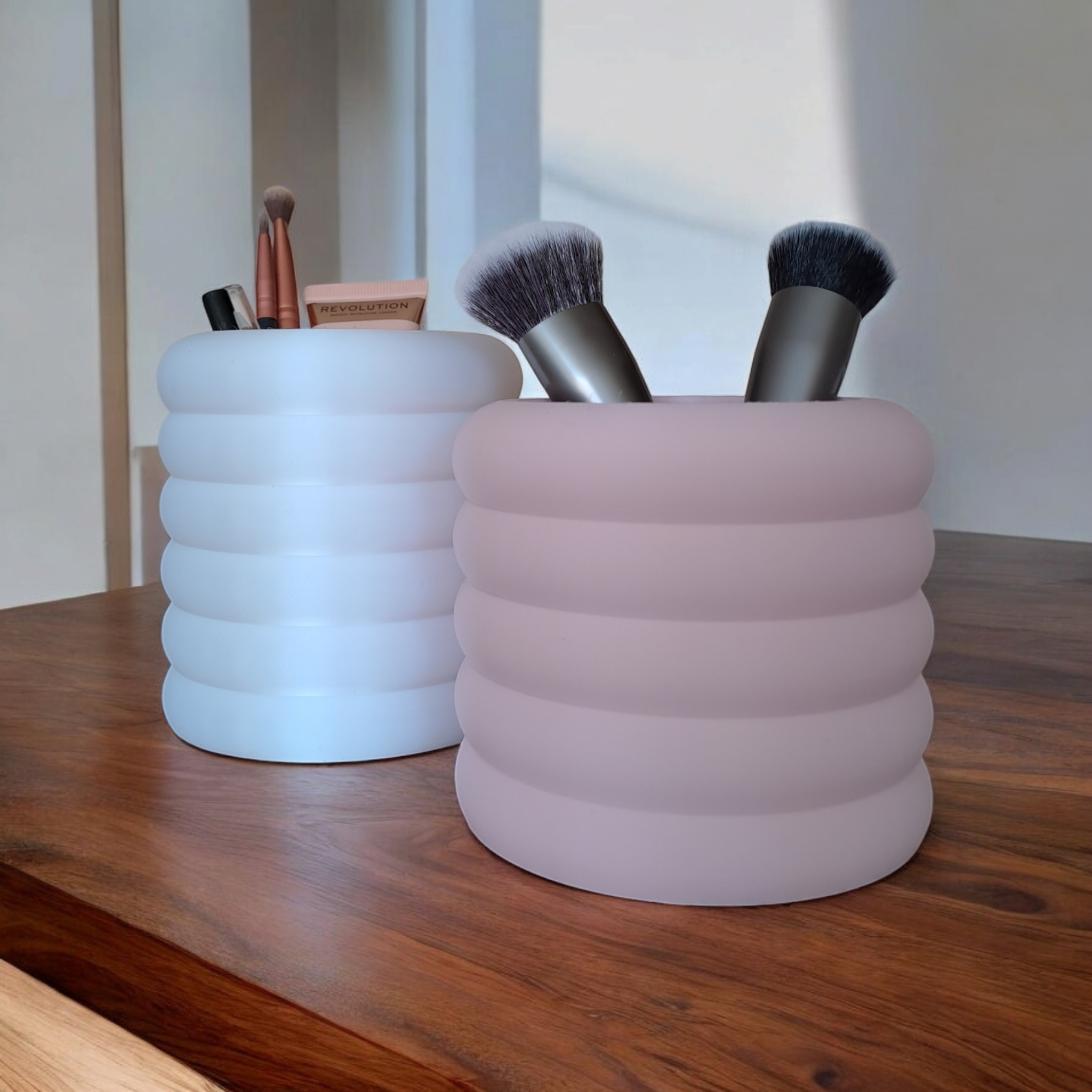 Dieses zweiteilige Organizer-Set bietet praktische und dekorative Aufbewahrung für Ihr Zuhause oder Büro. Die beiden Becher unterscheiden sich im Design: ein Becher mit fünf torusförmigen Aussparungen, der andere mit sechs, wodurch ein ansprechendes, strukturiertes Erscheinungsbild entsteht, das zugleich viel Platz für Ihre Alltagsgegenstände bietet. Gedruckt wurde das Set in PLA (Anycubic Silk PLA White und PolyTerra PLA Candy), wodurch eine glatte, farbkräftige Oberfläche entsteht. Die kompakten Abmessungen sind: Becher 1 – 100 × 100 × 87 mm; Becher 2 – 100 × 100 × 104 mm. Nutzen Sie das Set als Make-up-Pinselhalter, Stiftebecher, Büroutensilien-Aufbewahrung oder für Kleinteile im Bad und Hobbybereich. Die Pflege ist unkompliziert: Mit einem feuchten Tuch abwischen; auf aggressive Reinigungsmittel verzichten. Das Set ist funktional und zugleich ein stilvolles Detail für Schreibtisch, Schminktisch oder Regal.